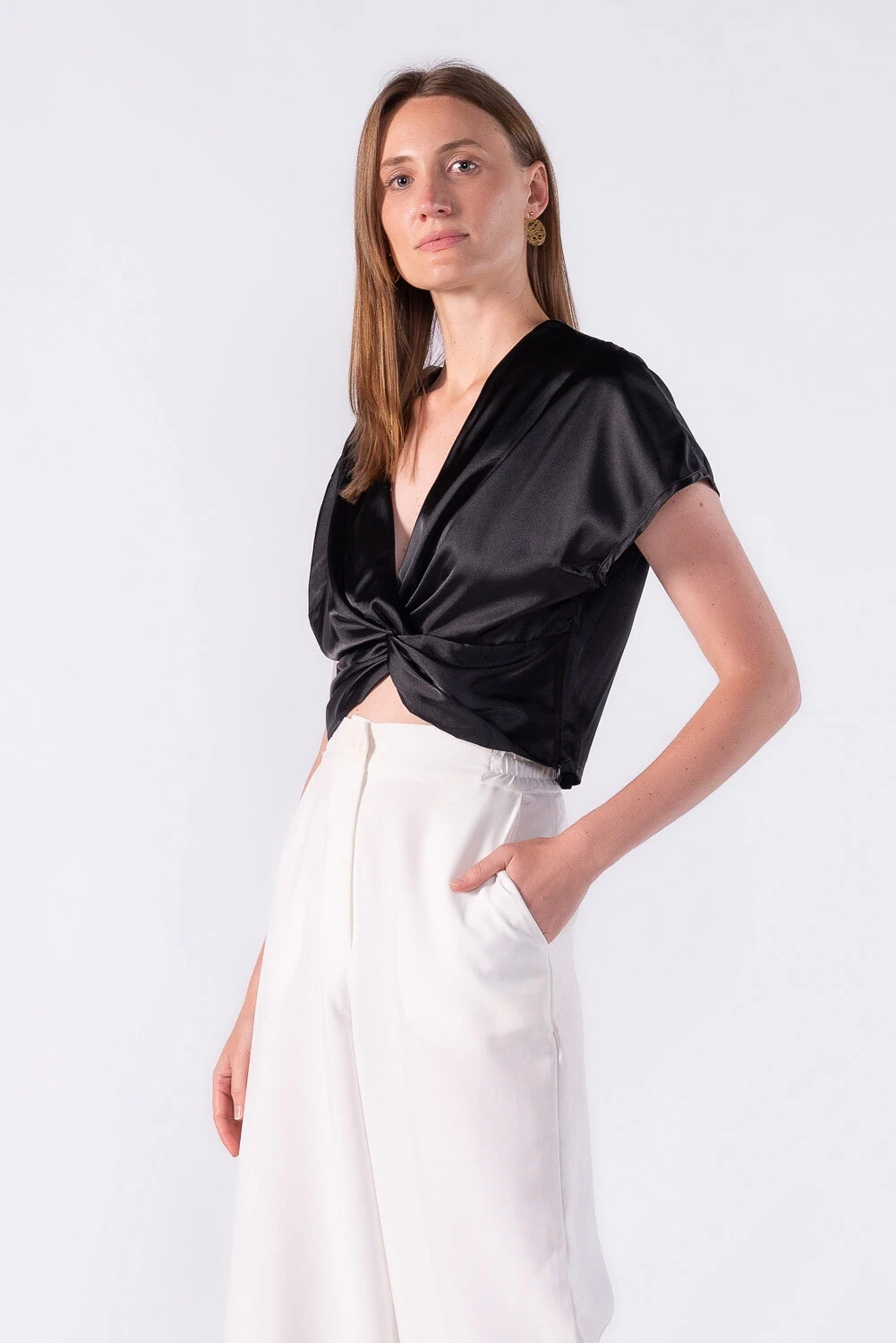 Blusa curta acetinada com detalhe frontal