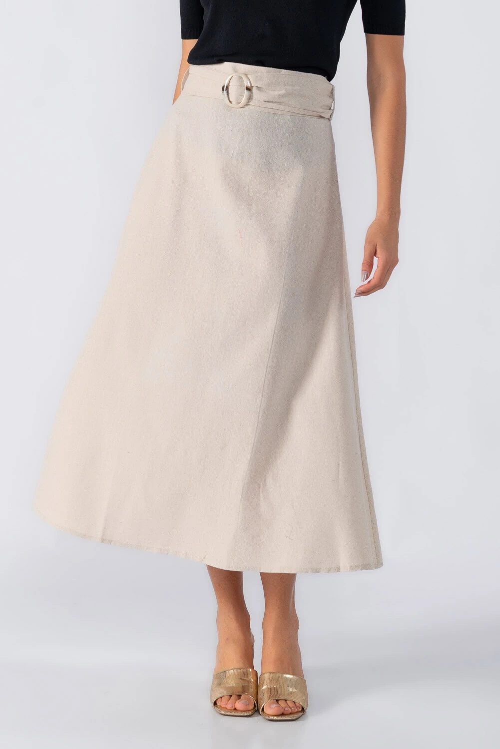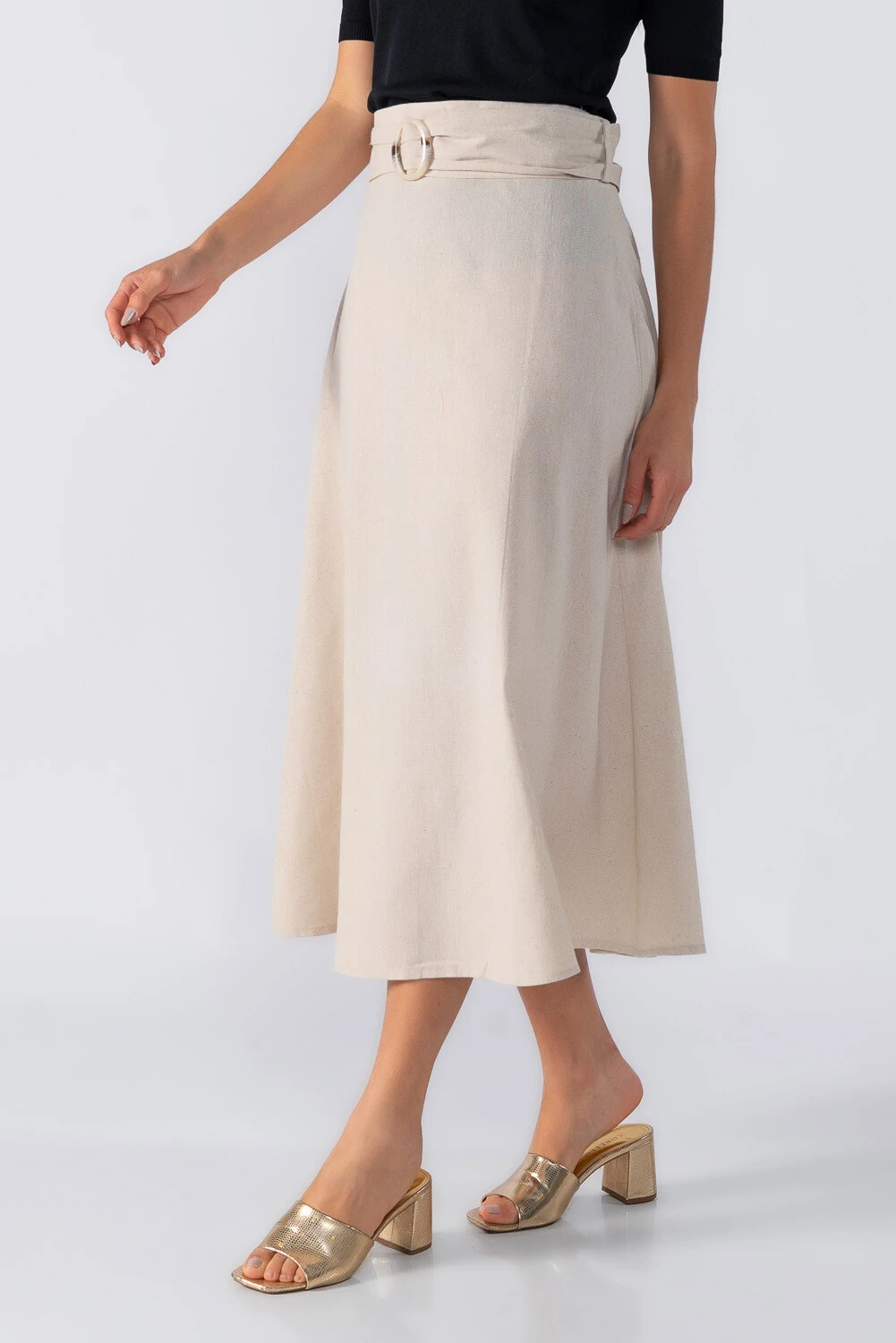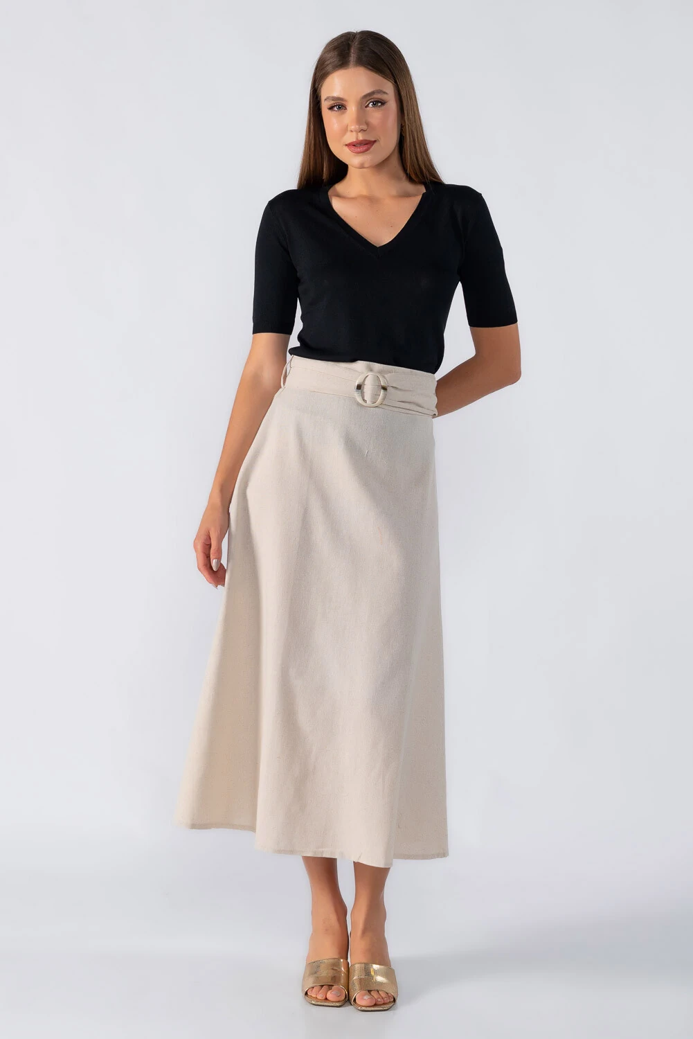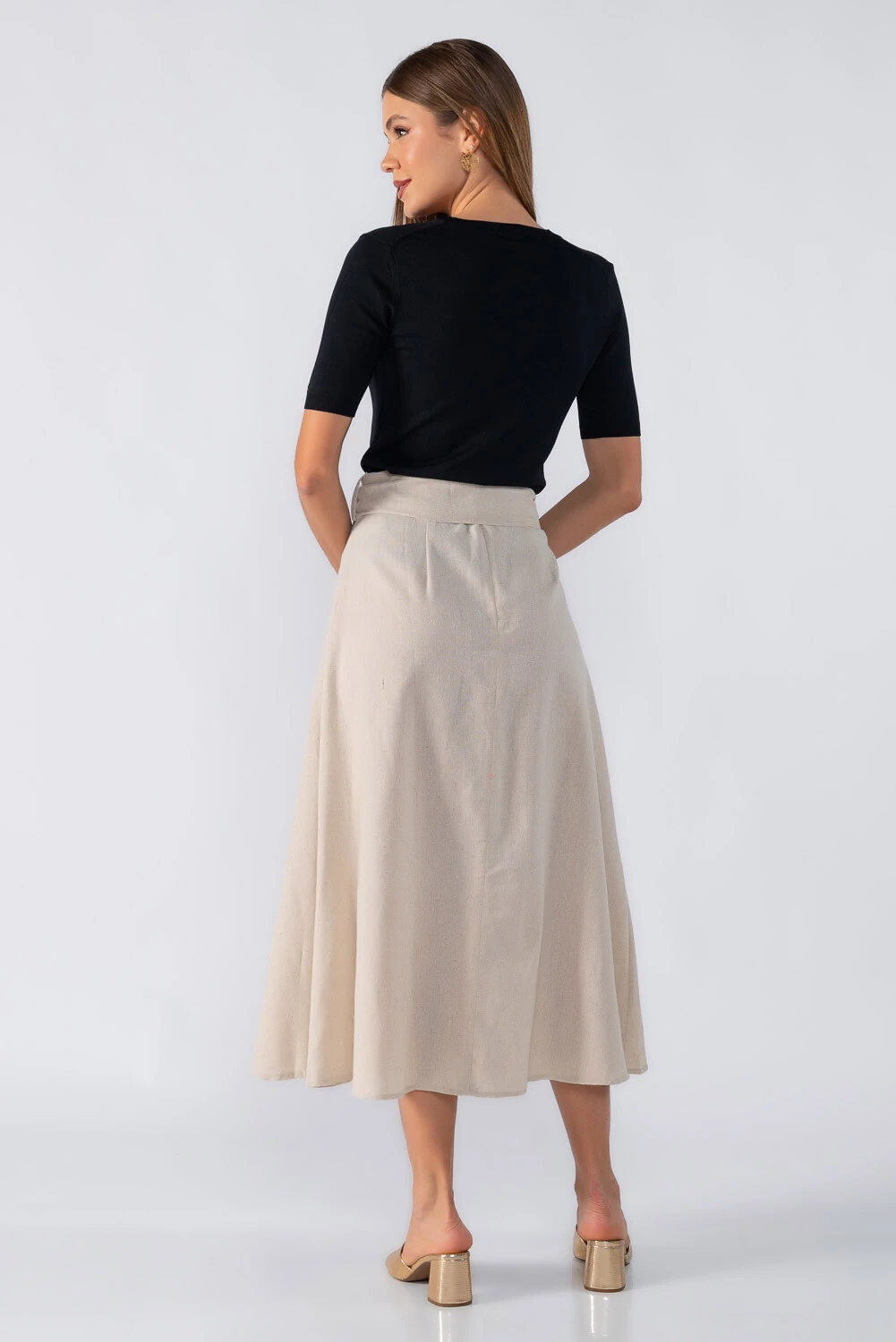 Saia midi evasê fechamento em zíper invisível e cinto