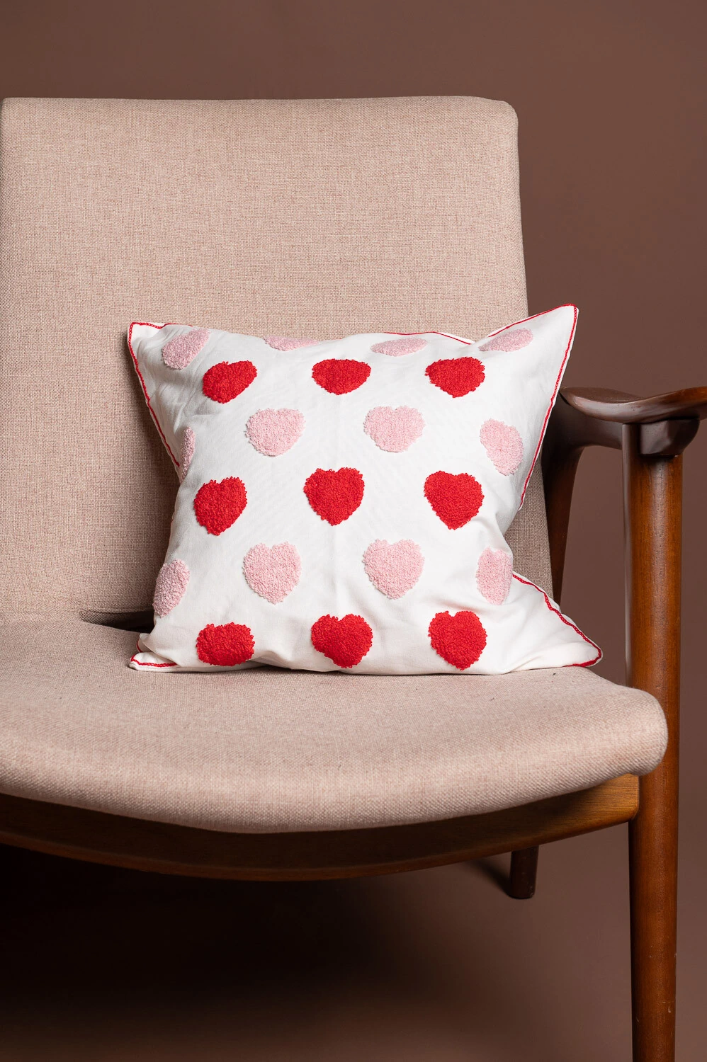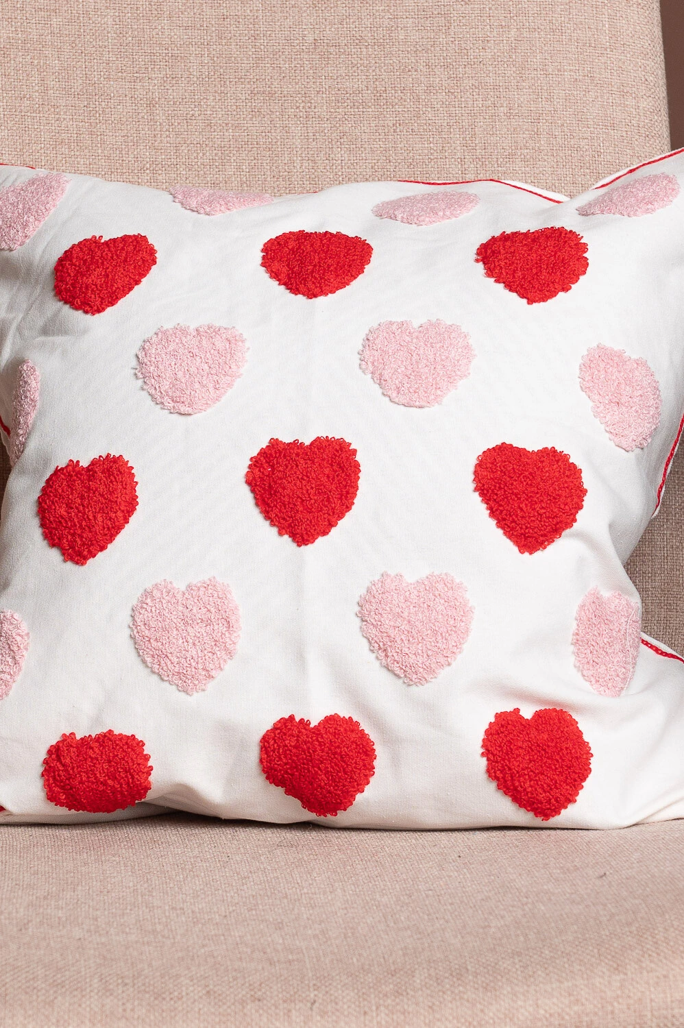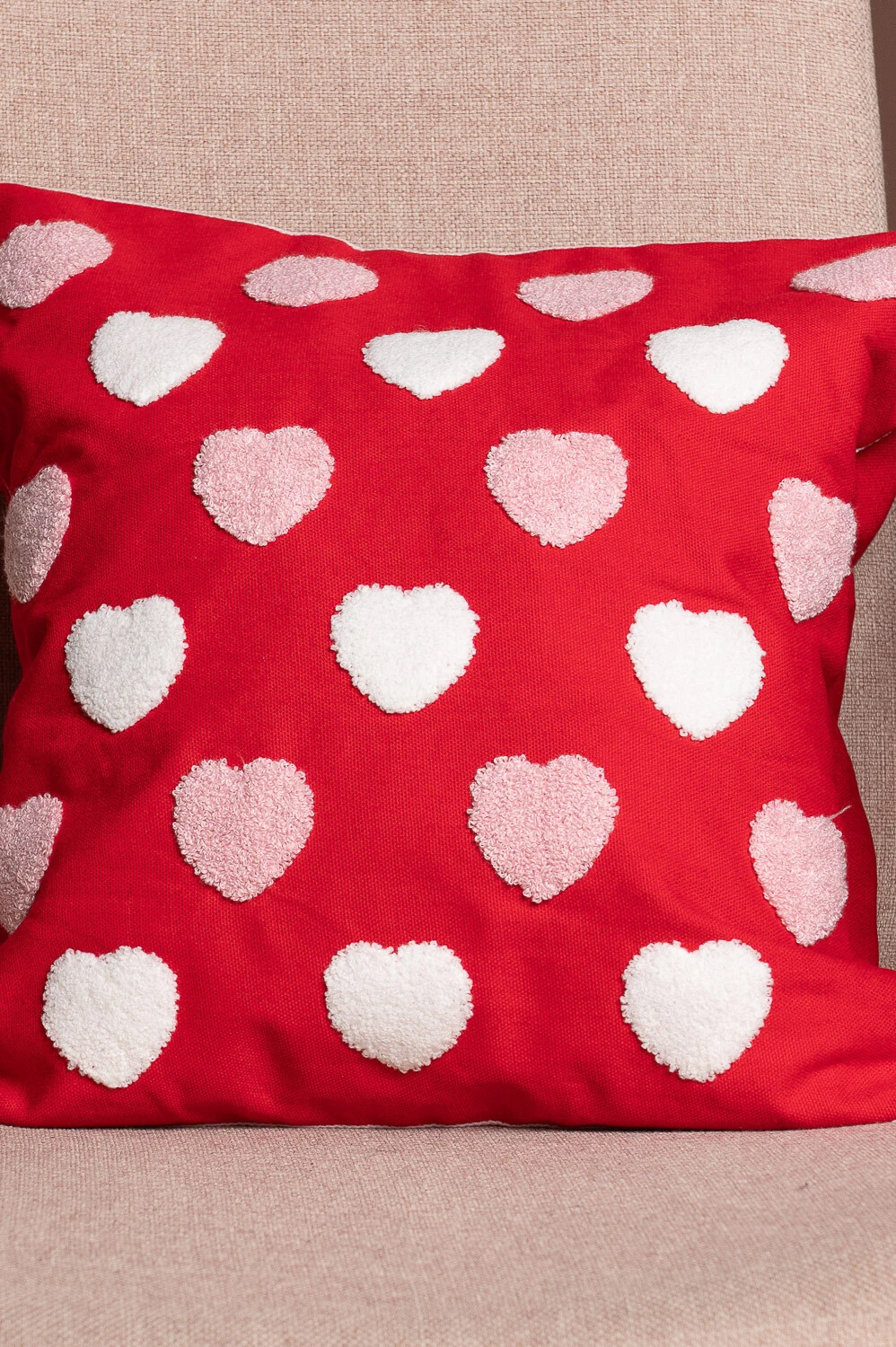 Capa de almofada 45x45cm em 100% poliéster, com corações multicoloridos bordados. Toque divertido e decorativo.