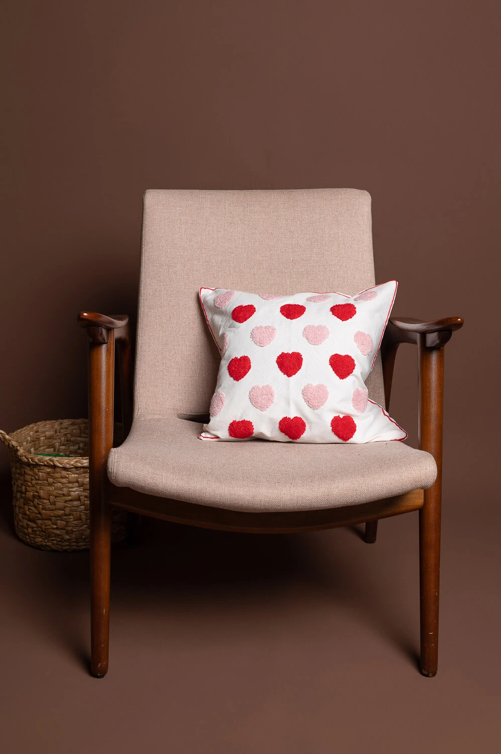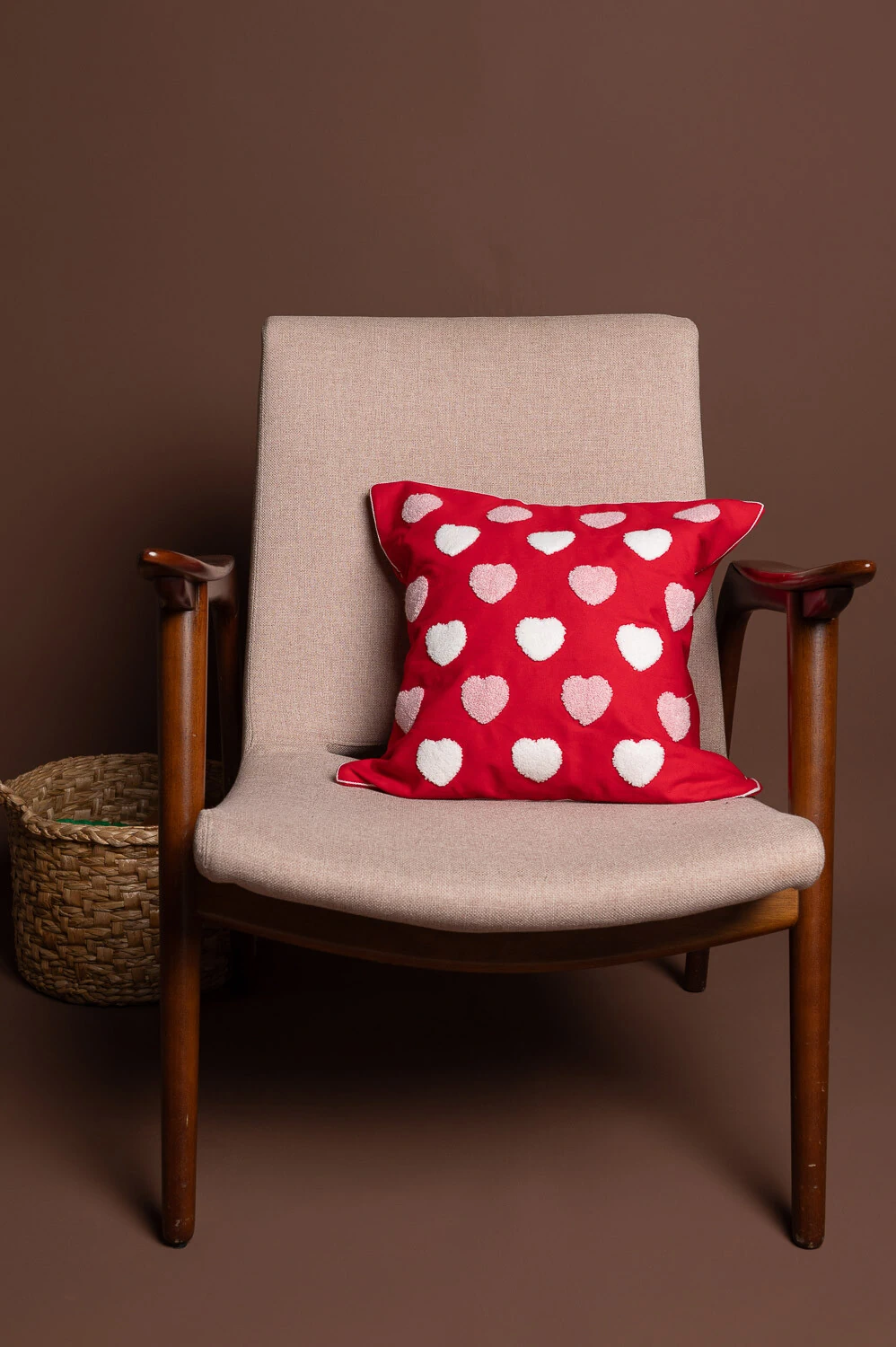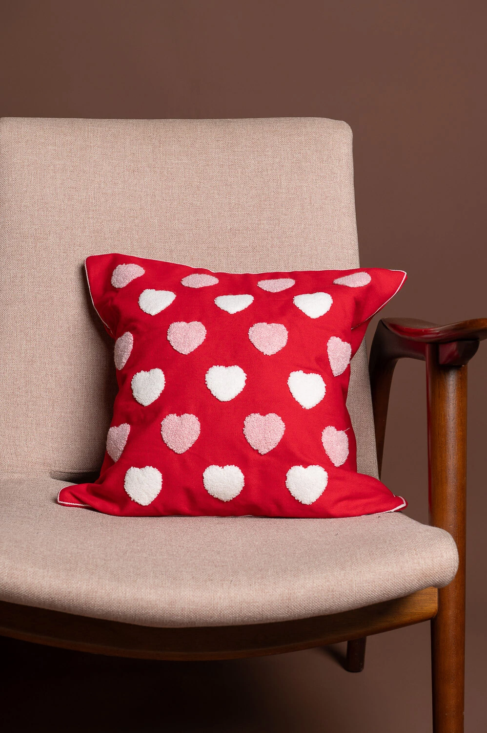 Capa de almofada 45x45cm em 100% poliéster, com corações multicoloridos bordados. Toque divertido e decorativo.