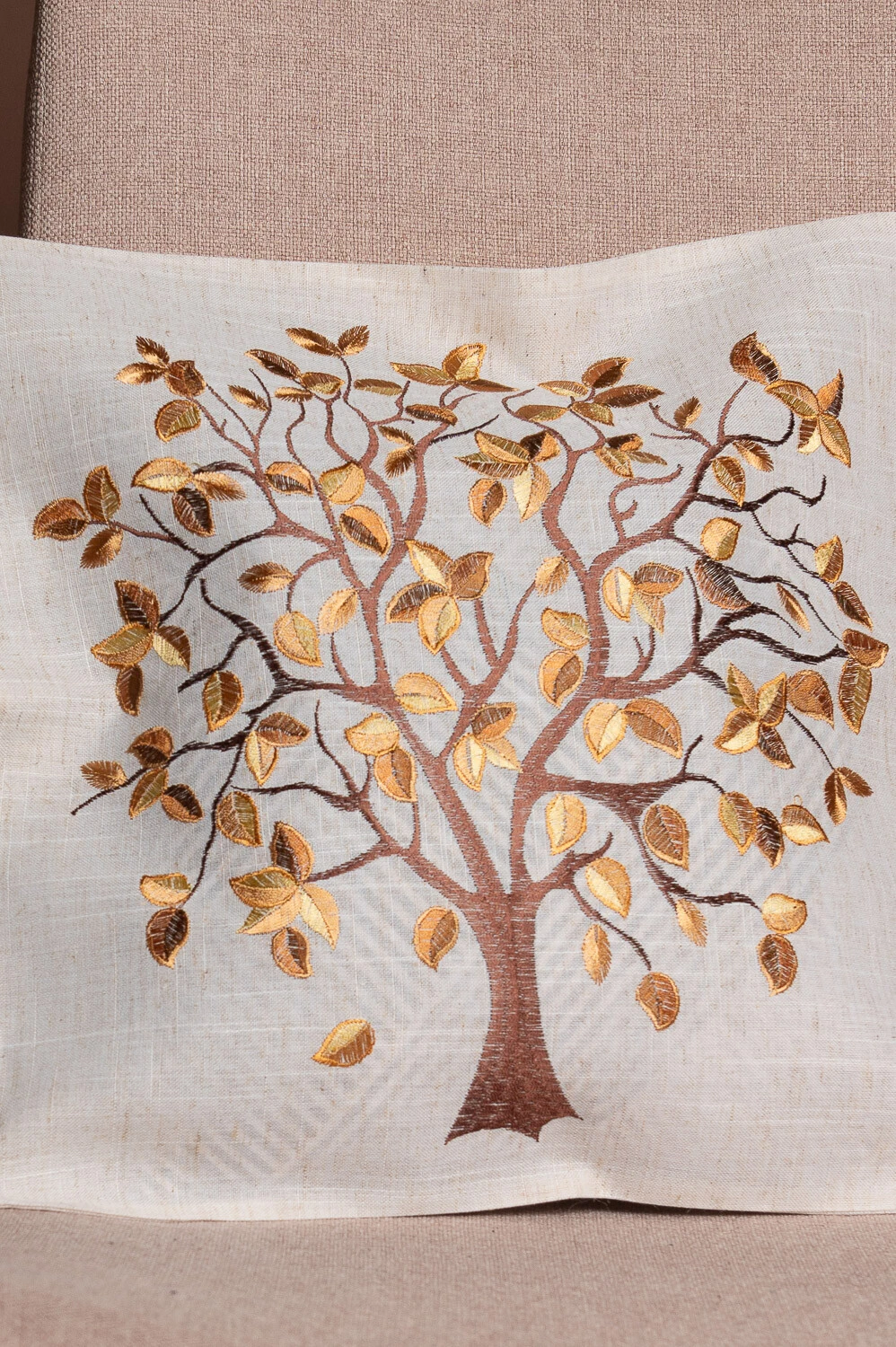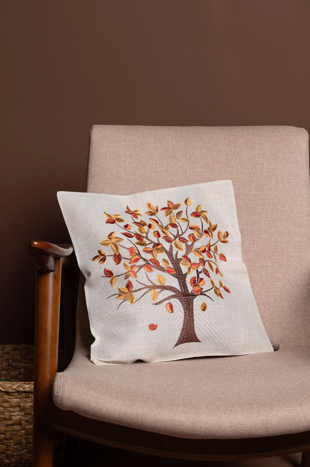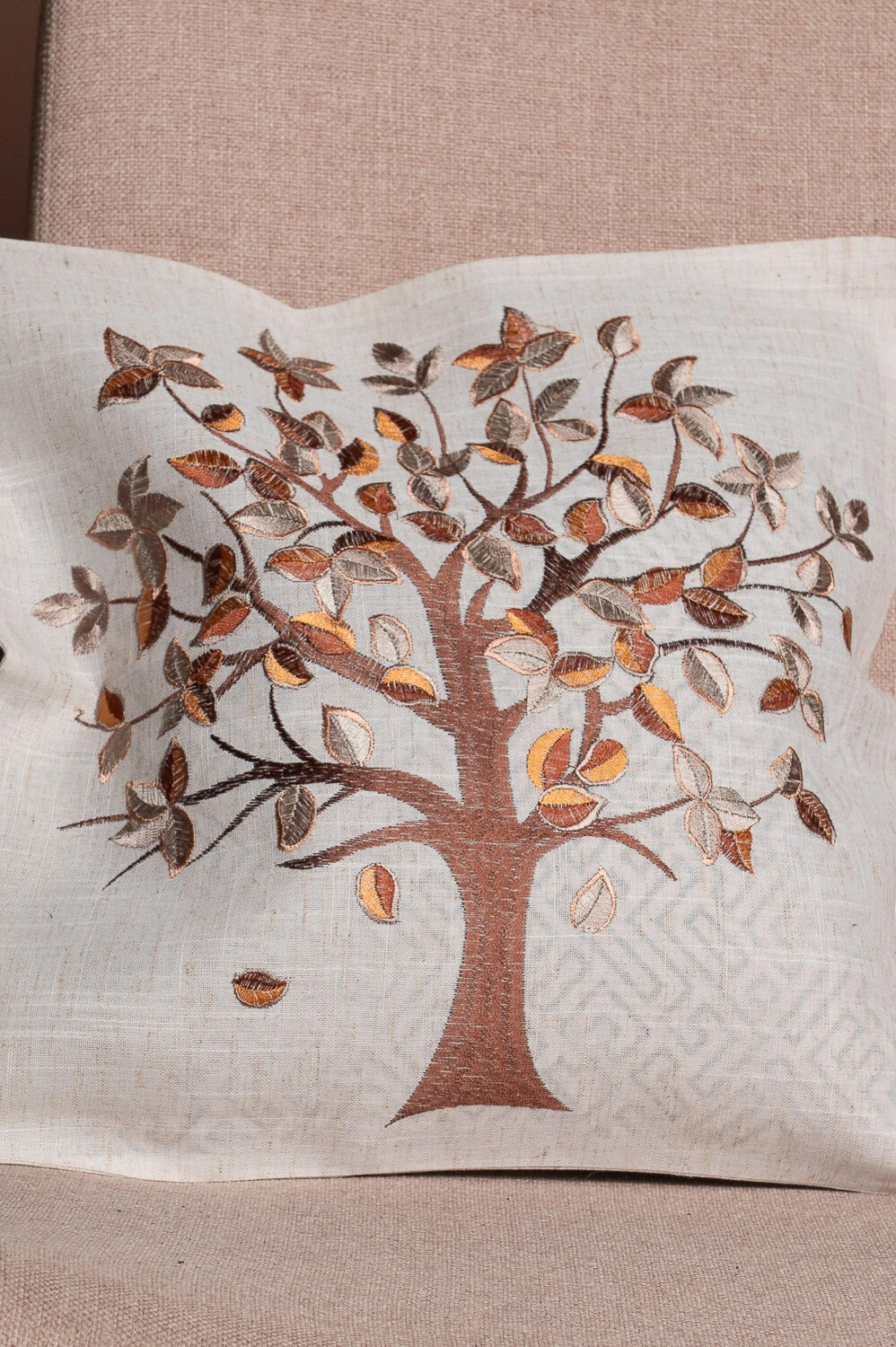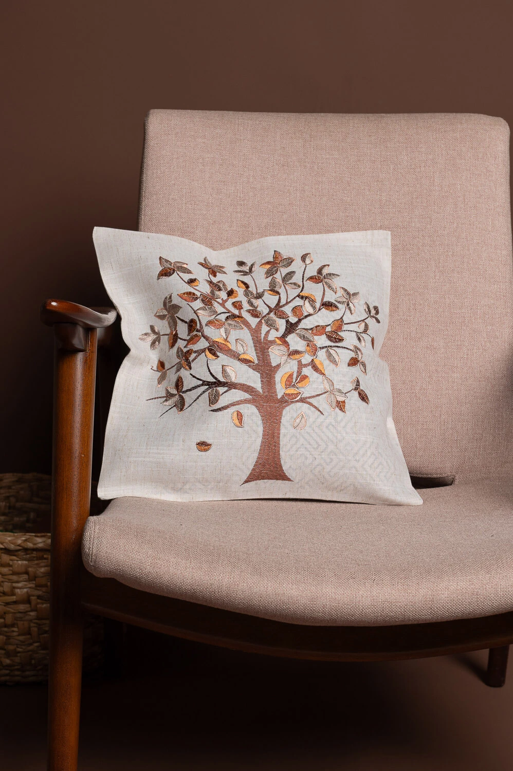 Capa de almofada 45x45cm com árvore bordada e toque rústico, confeccionada em 100% poliéster. Ideal para adicionar charme e textura à decoração.