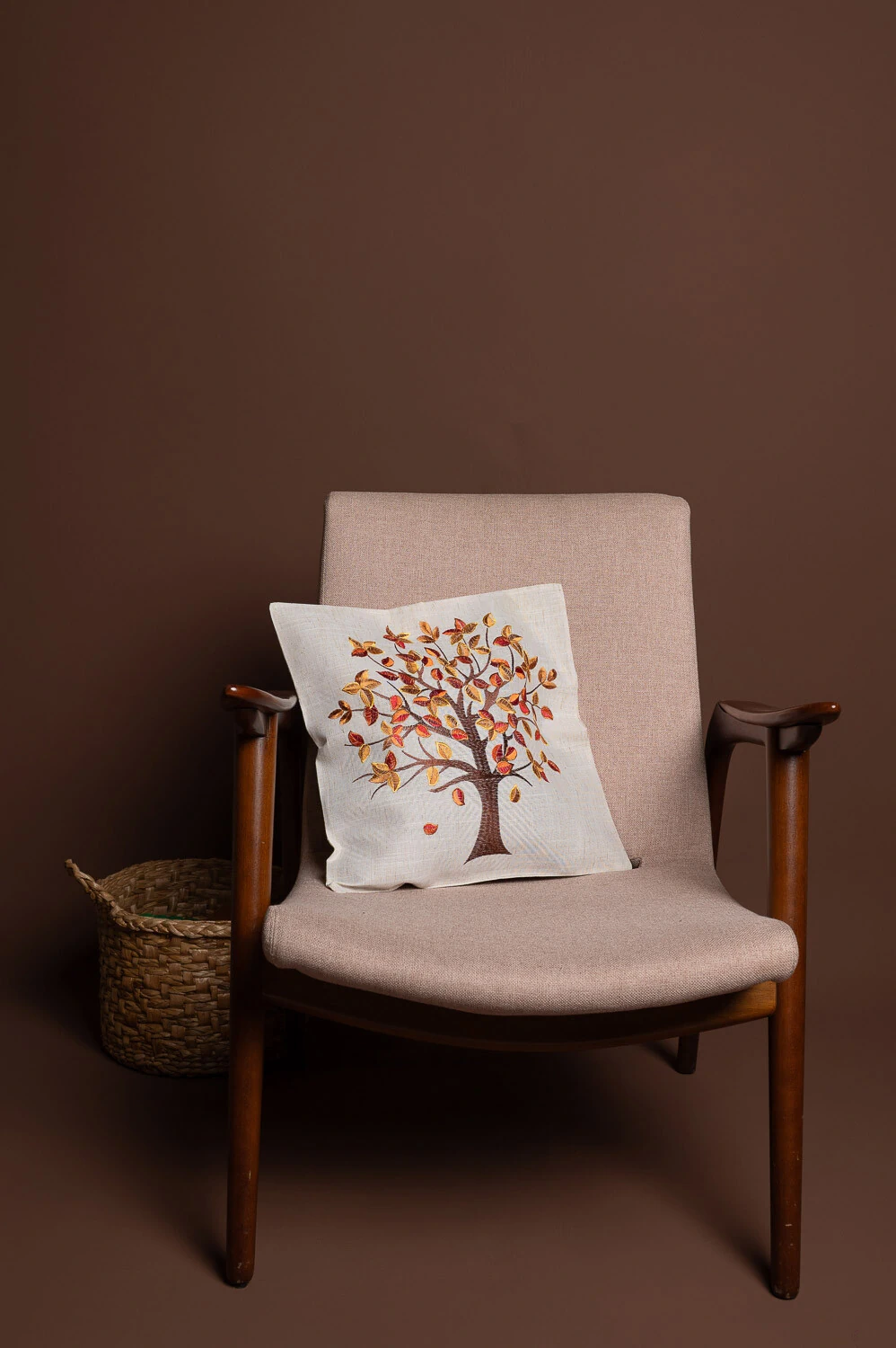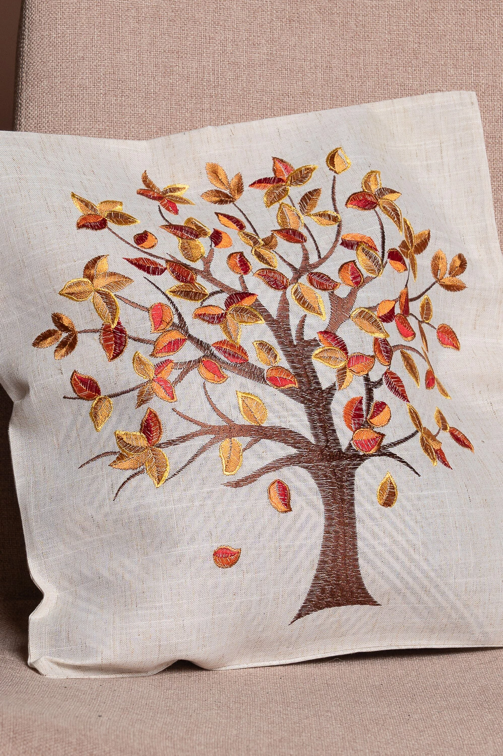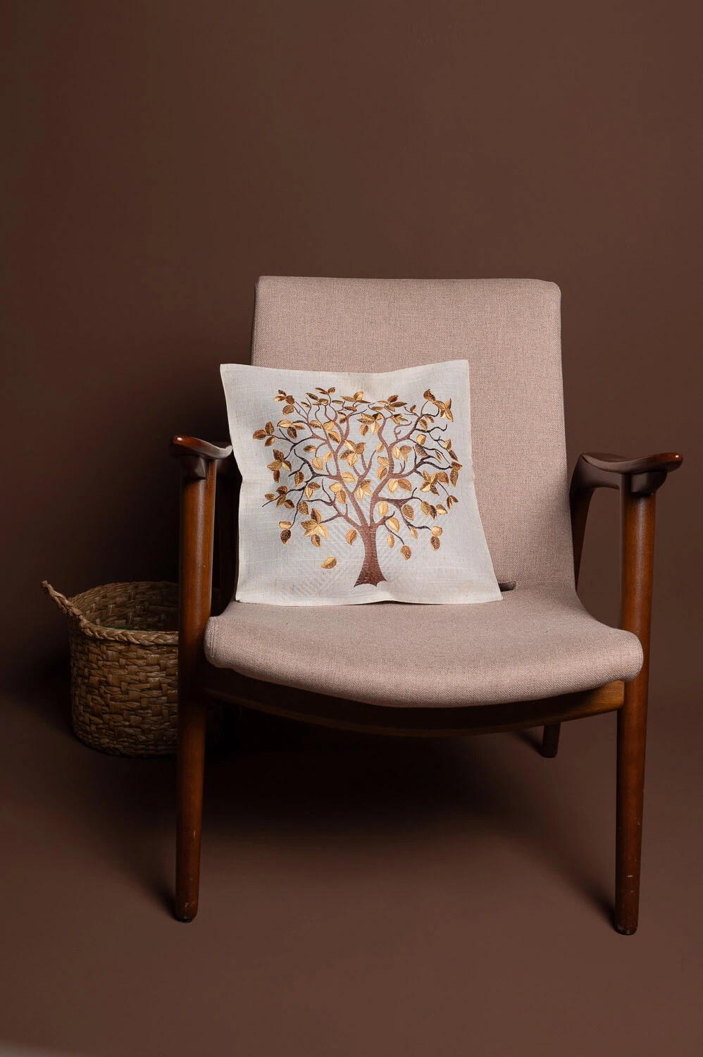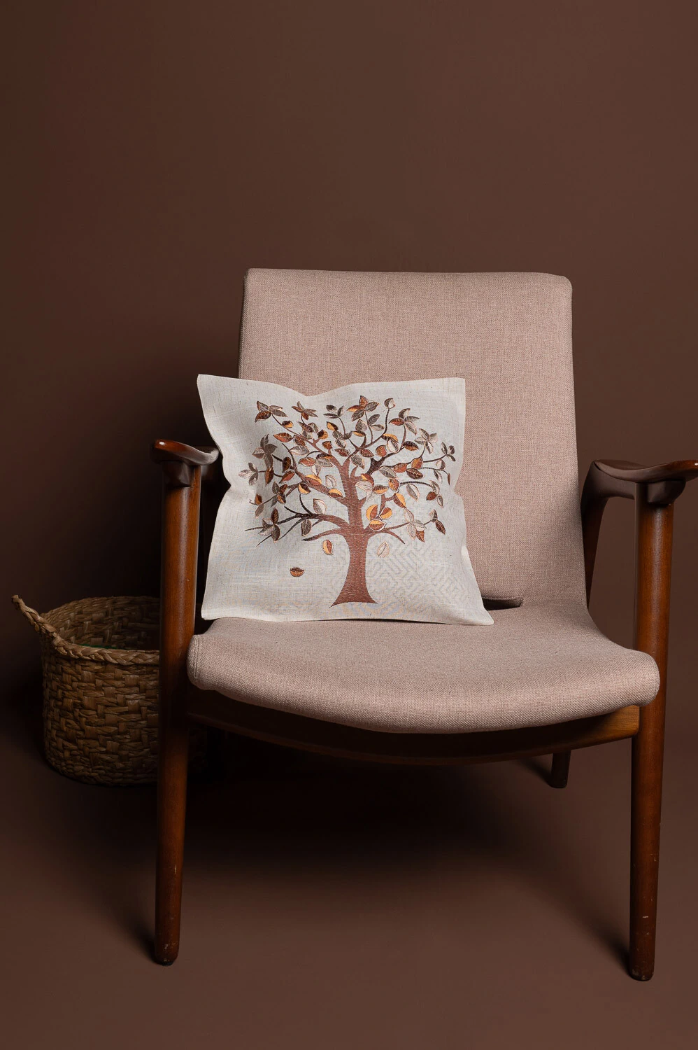 Capa de almofada 45x45cm com árvore bordada e toque rústico, confeccionada em 100% poliéster. Ideal para adicionar charme e textura à decoração.