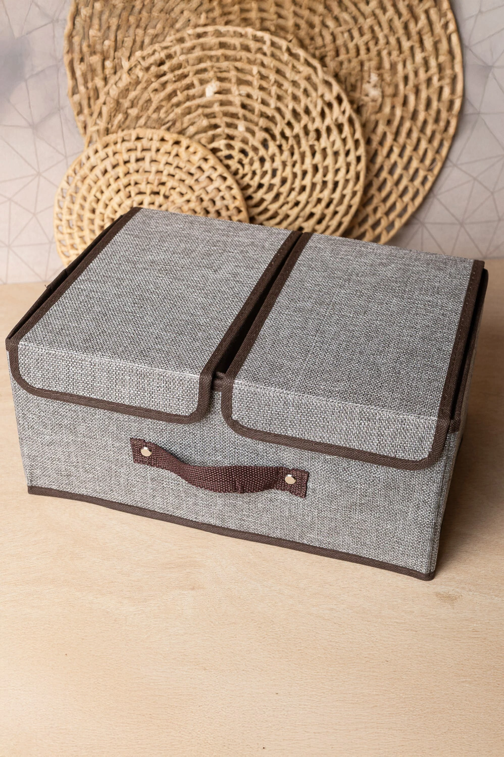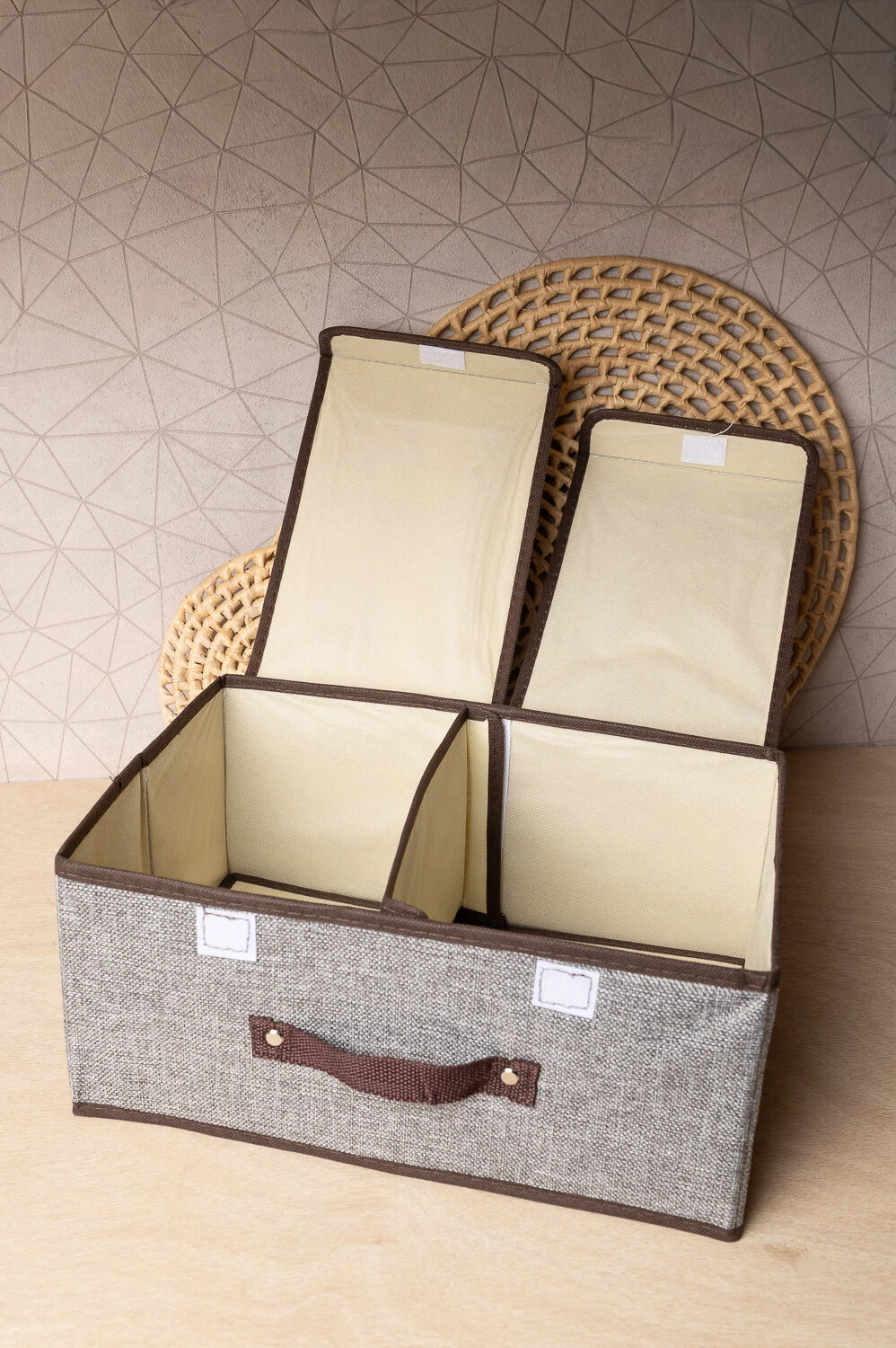 Caixa organizadora em formato de maleta, montável e com 2 divisórias. Versátil, funcional e simples de montar.