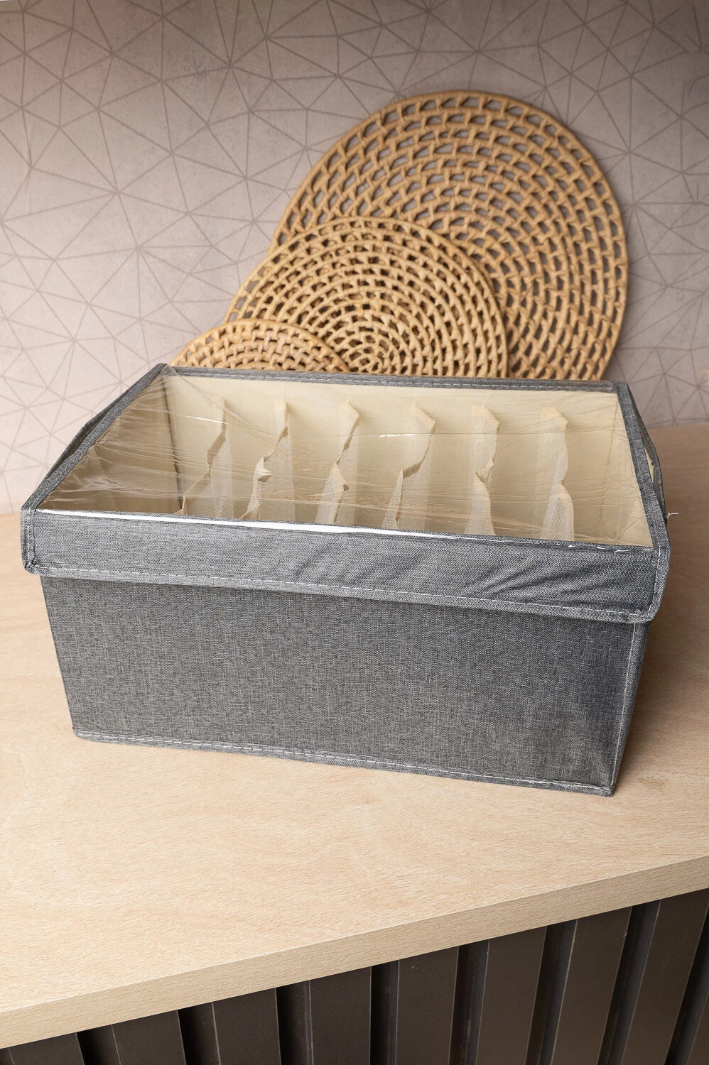 Caixa organizadora com tampa plastificada e 7 divisórias, ideal para manter tudo protegido e bem distribuído. Prática e funcional para o dia a dia.