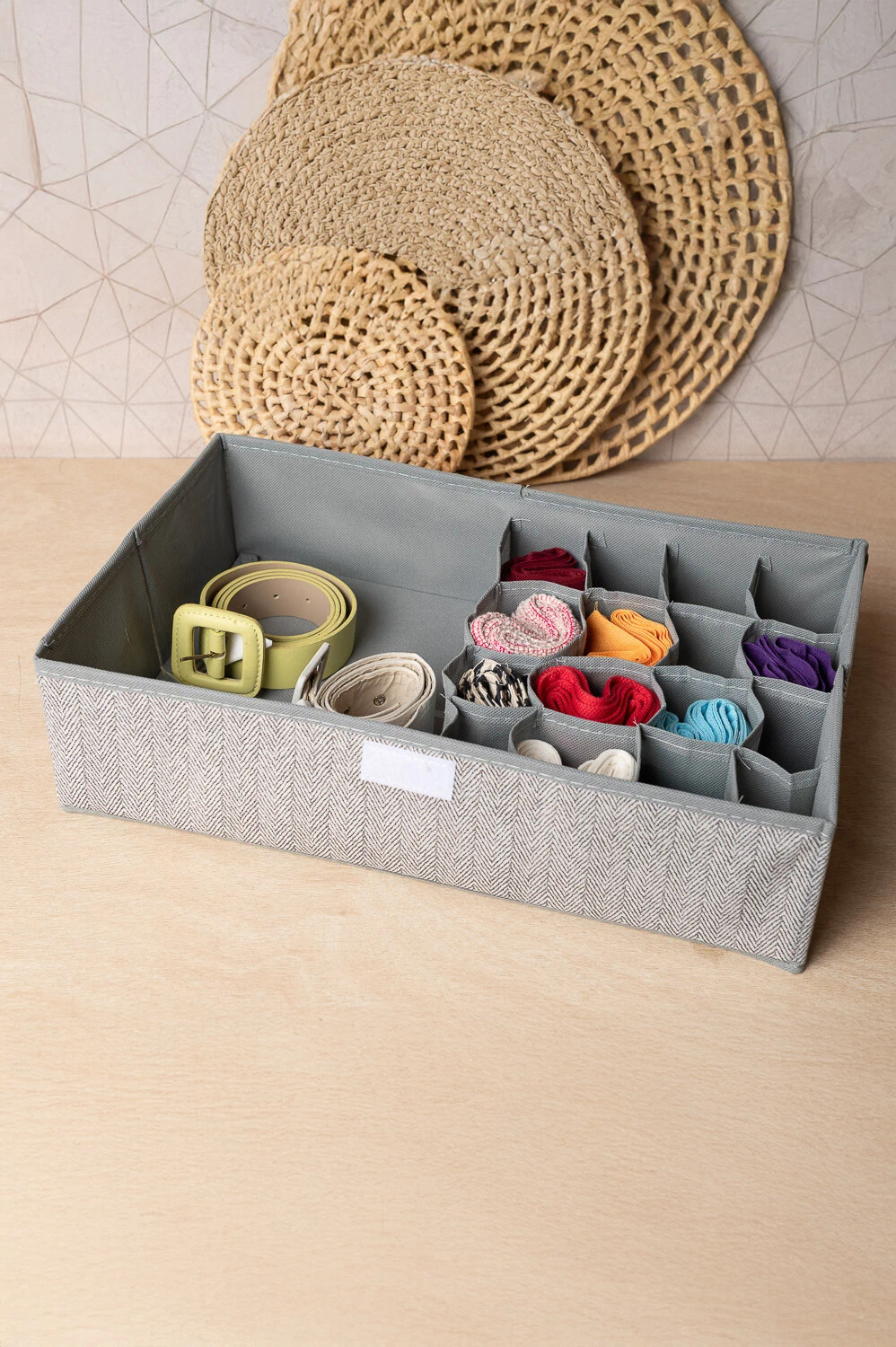 Organizador com 17 compartimentos, dobrável e confeccionado em poliéster. Excelente para otimizar espaço e facilitar o acesso aos seus itens do dia a dia.