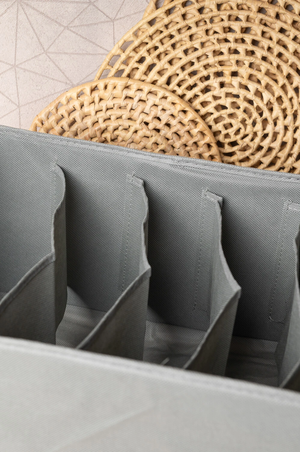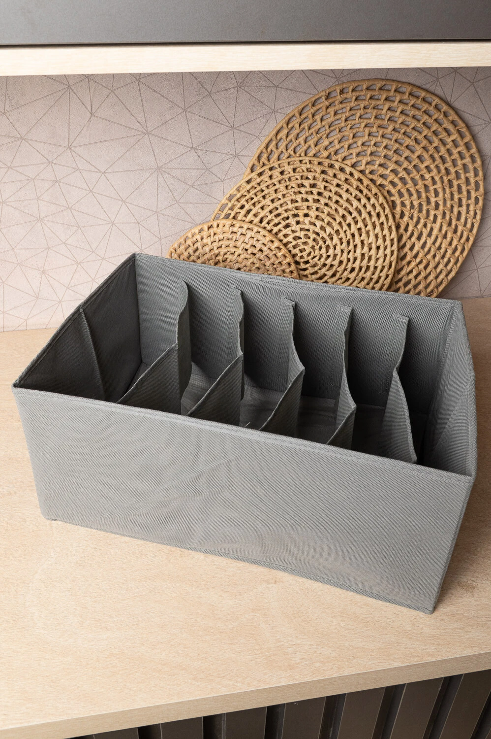 Caixa organizadora com 6 divisórias abertas em poliéster, oferecendo distribuição prática e organização eficiente para diferentes categorias de itens.