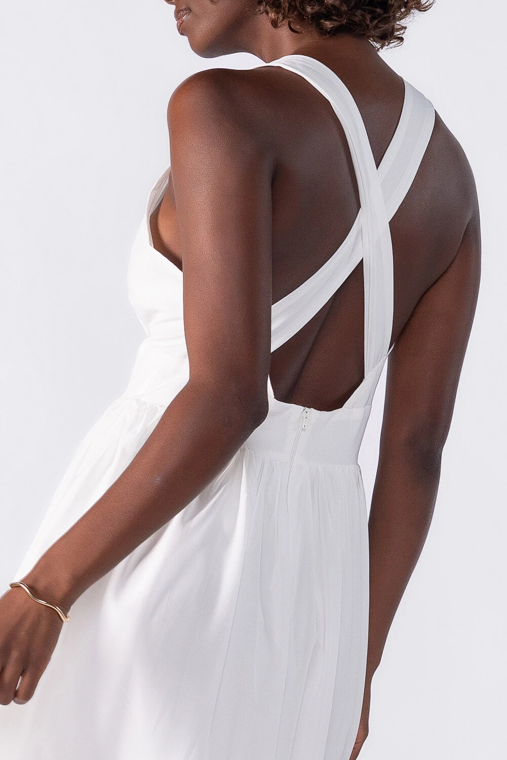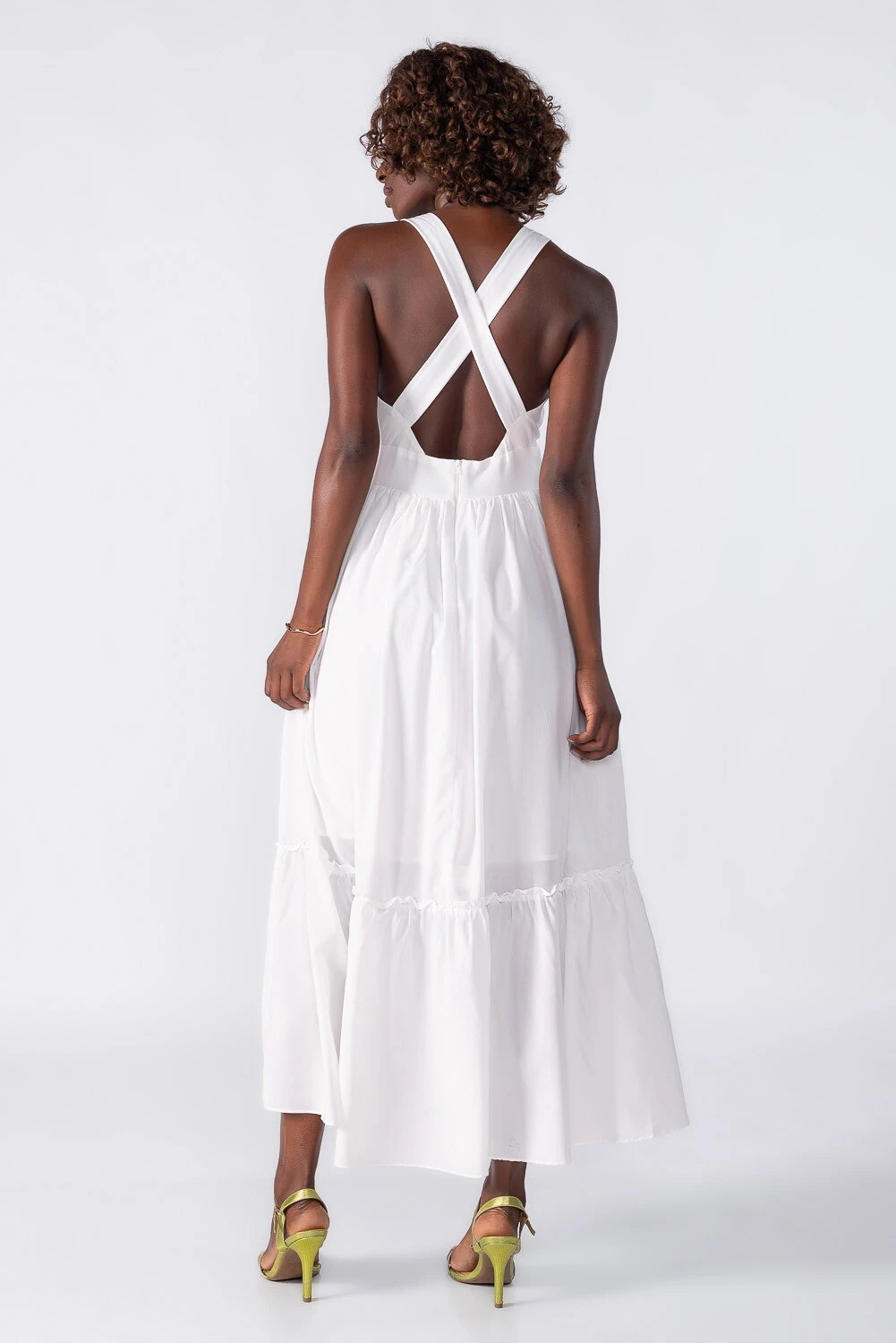 Vestido midi com decote nas costas e babado na barra