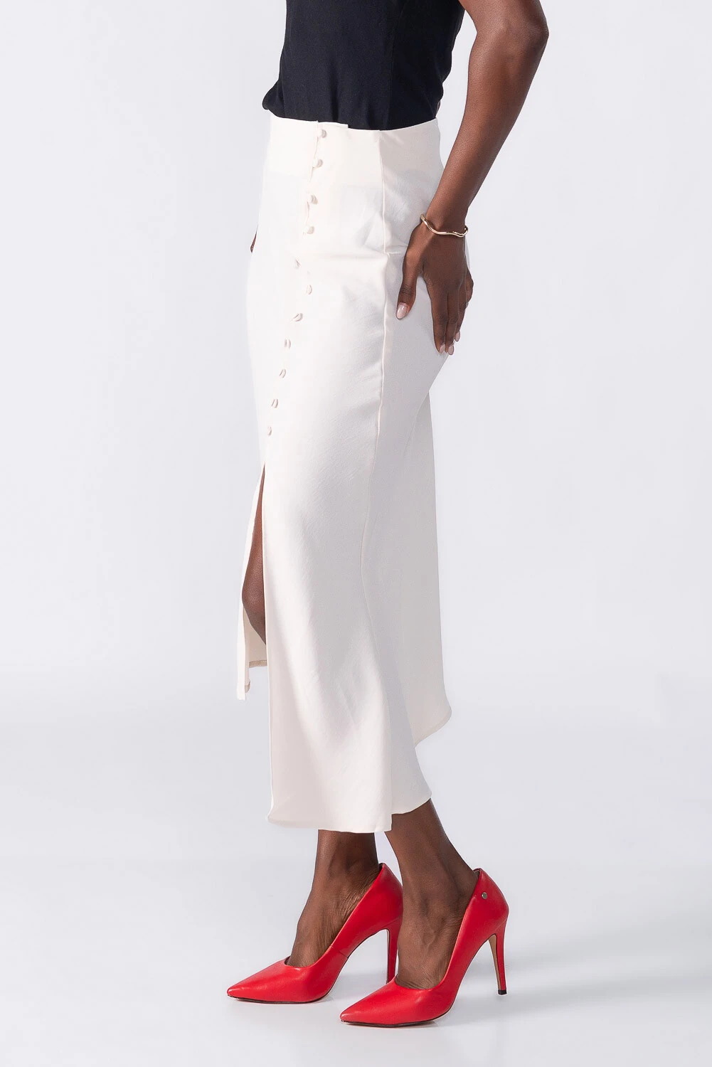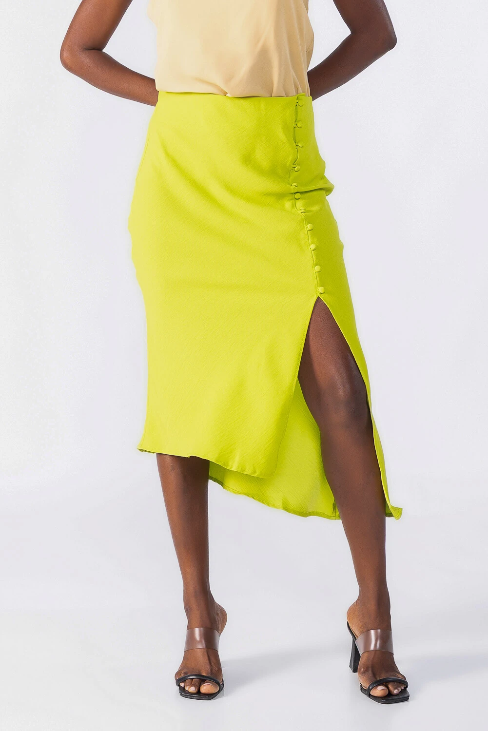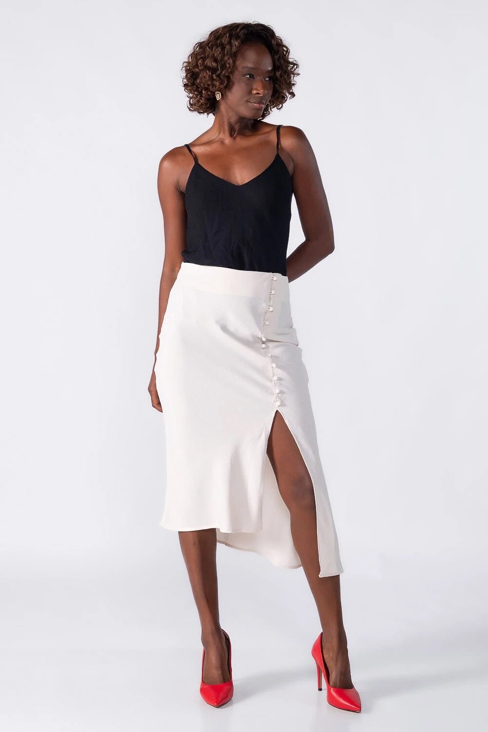 Saia midi assimétrica com botões forrados