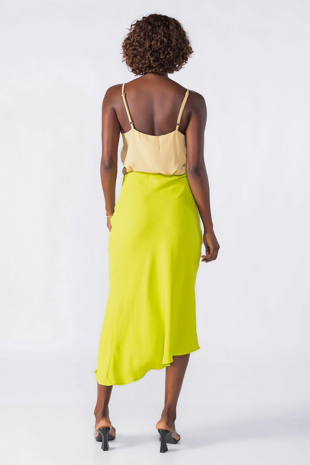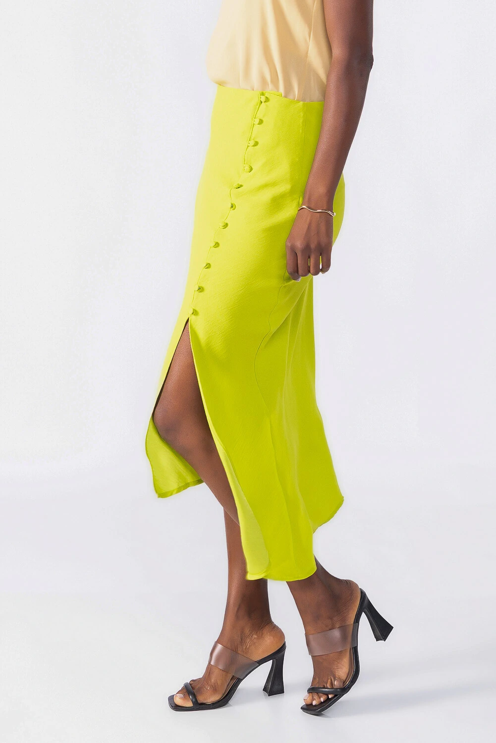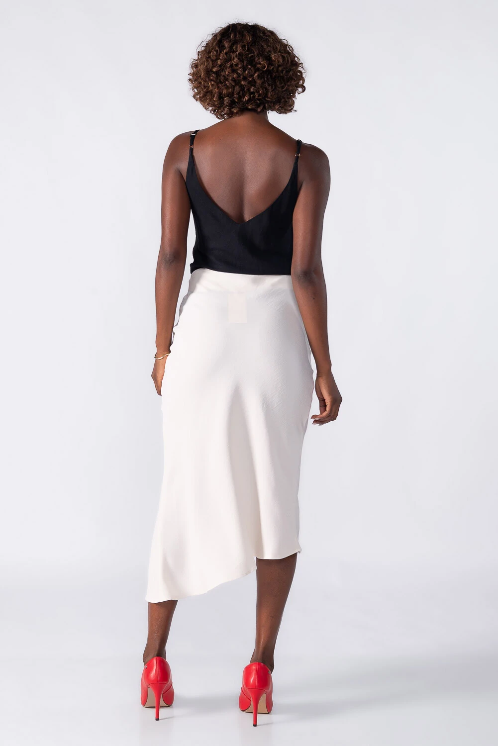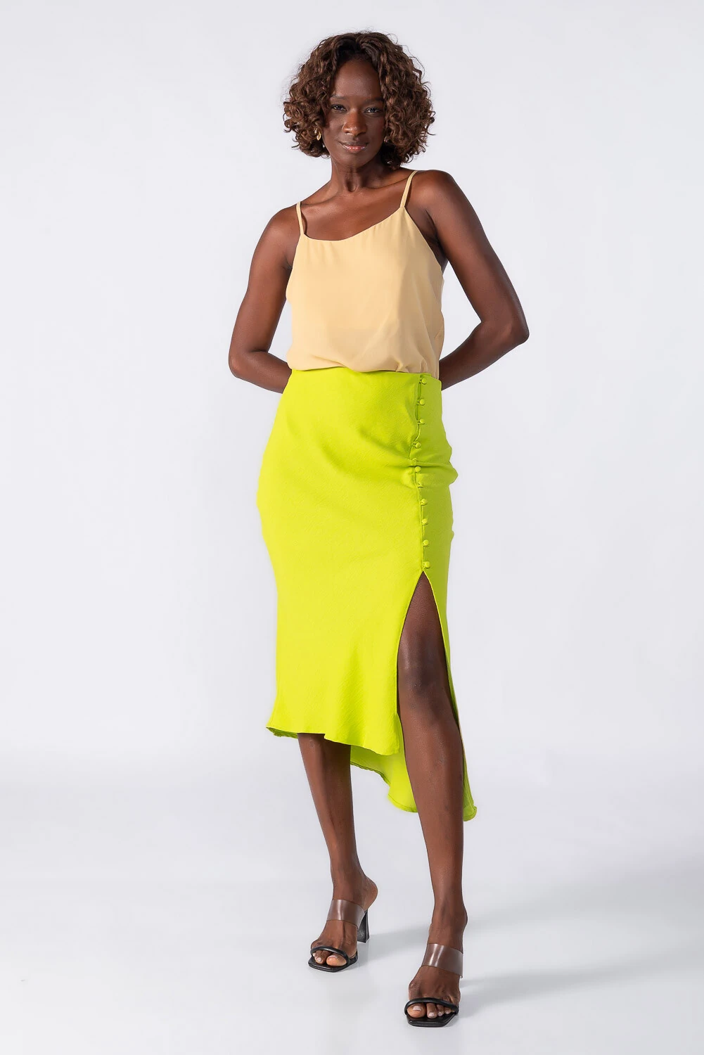 Saia midi assimétrica com botões forrados