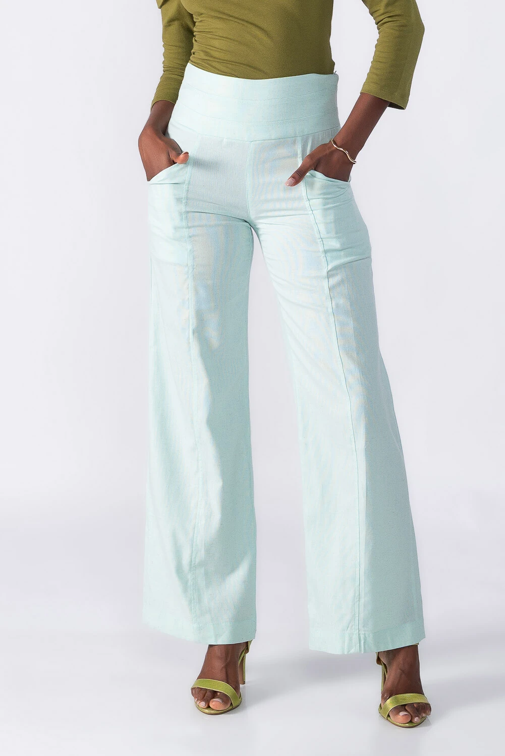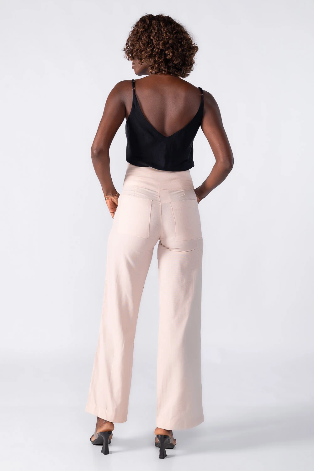 Calça reta com cós largo bolsos e recortes