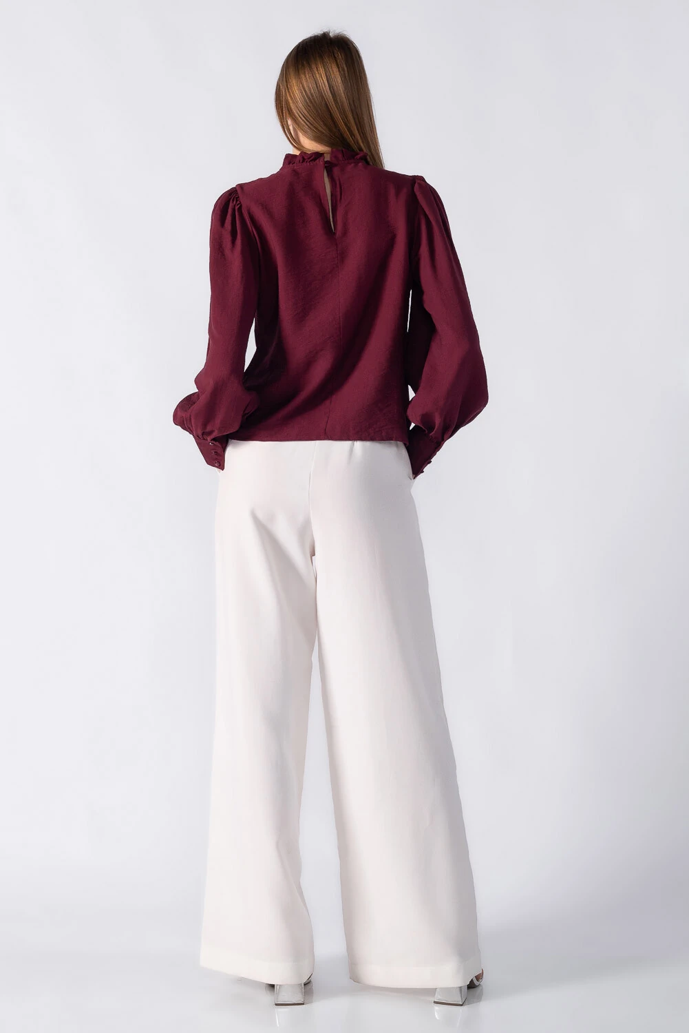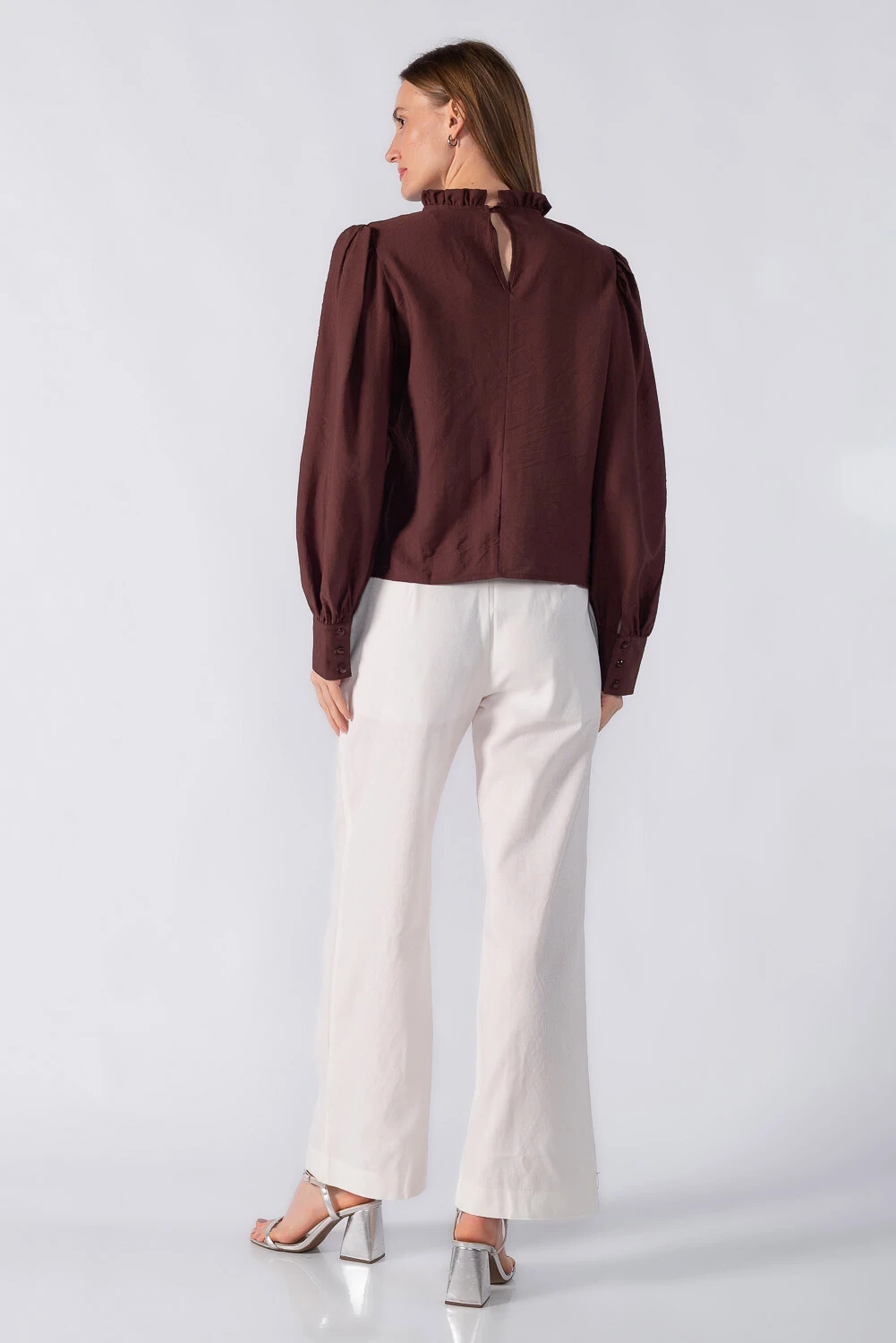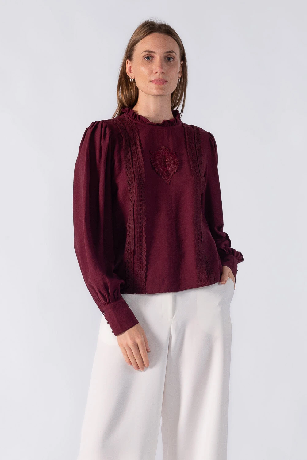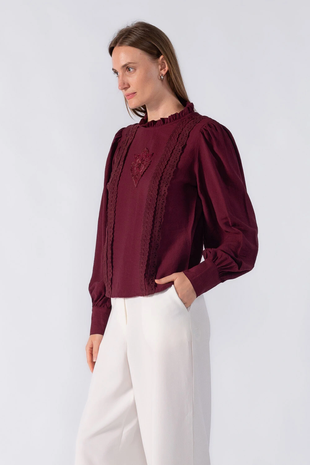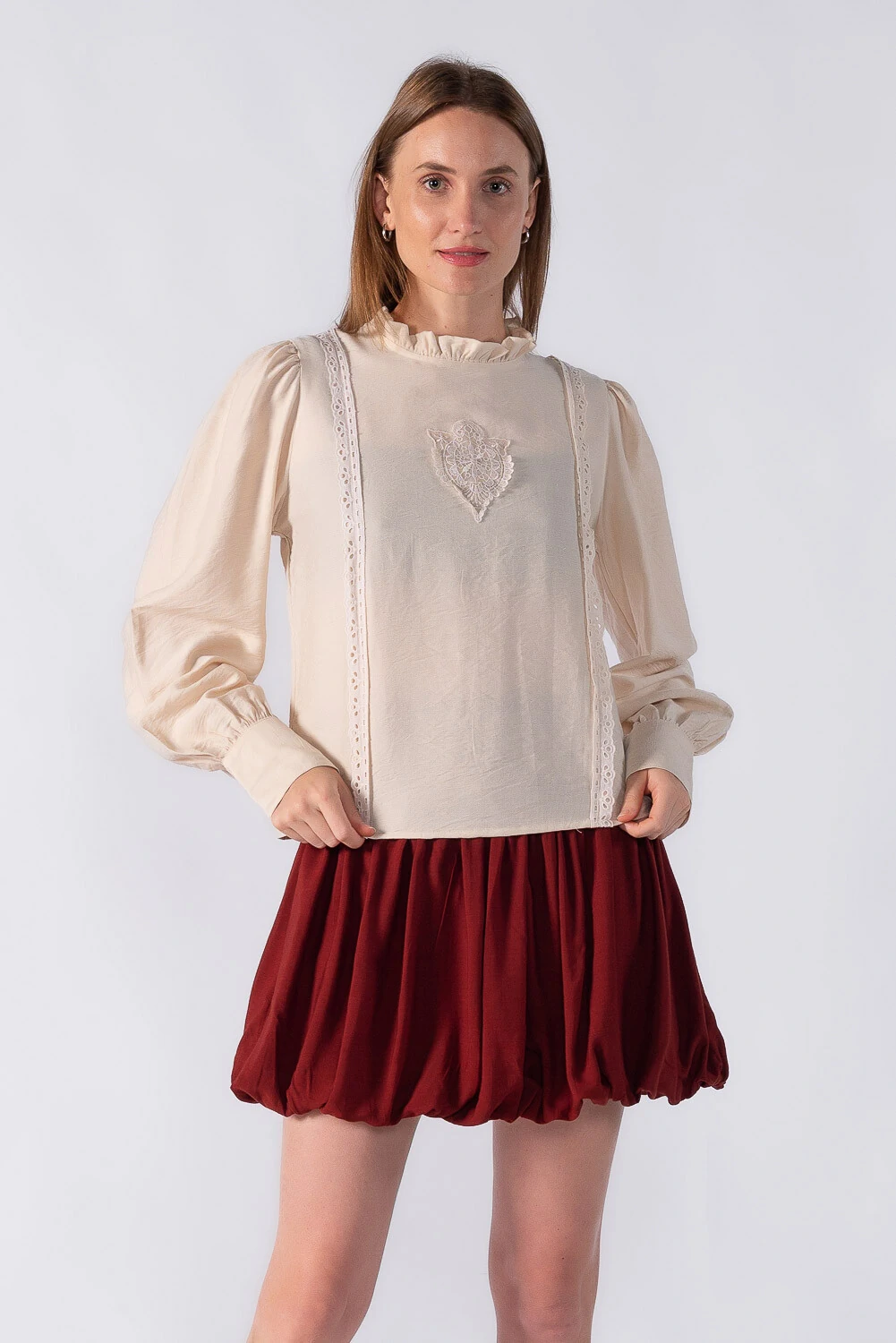 Blusa bata com detalhes em renda manga bufante e gola alta