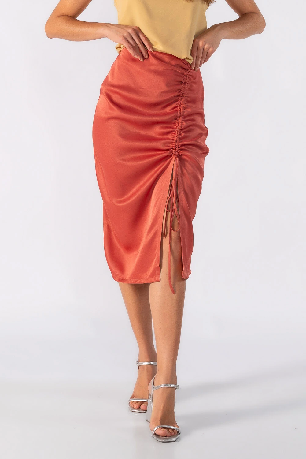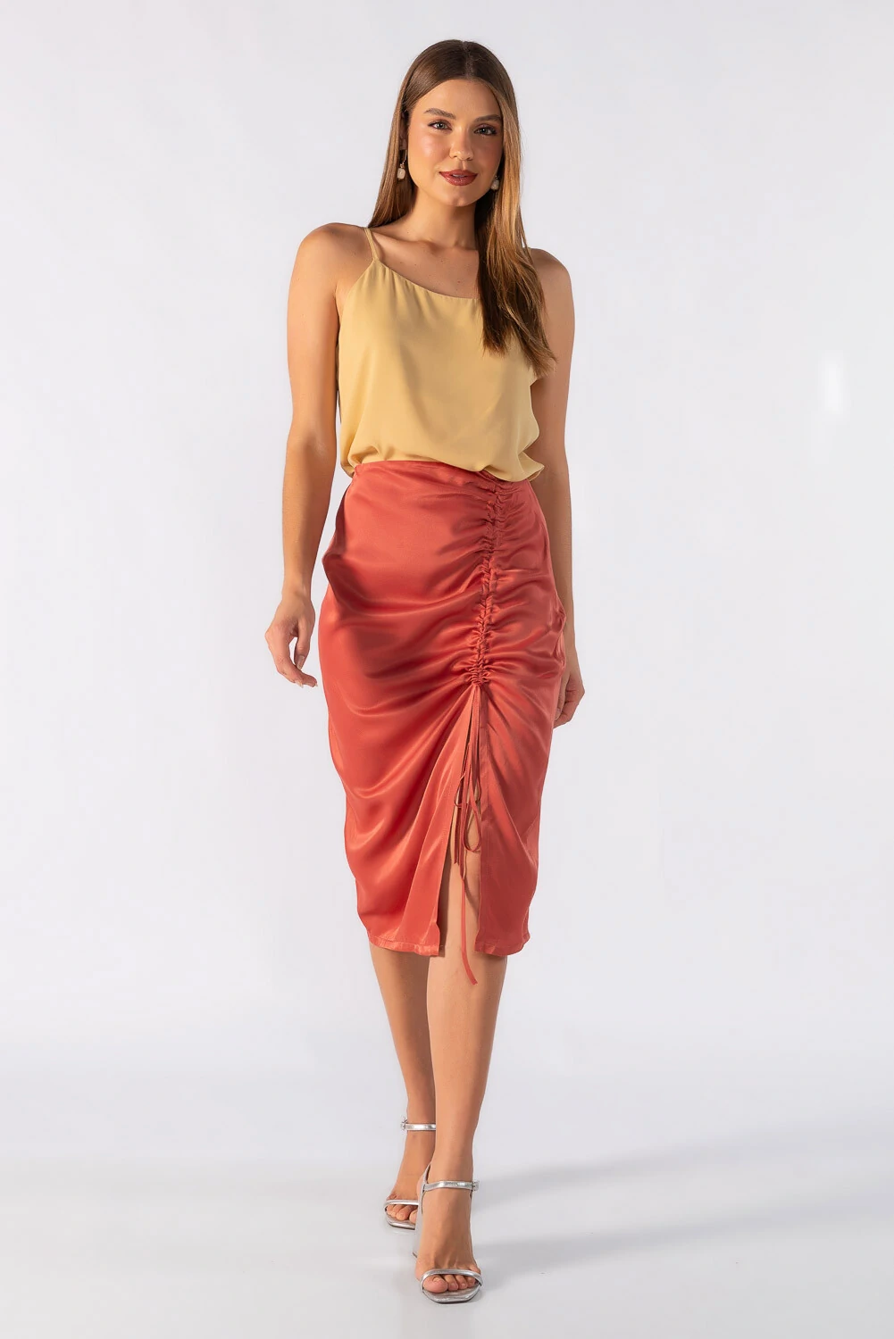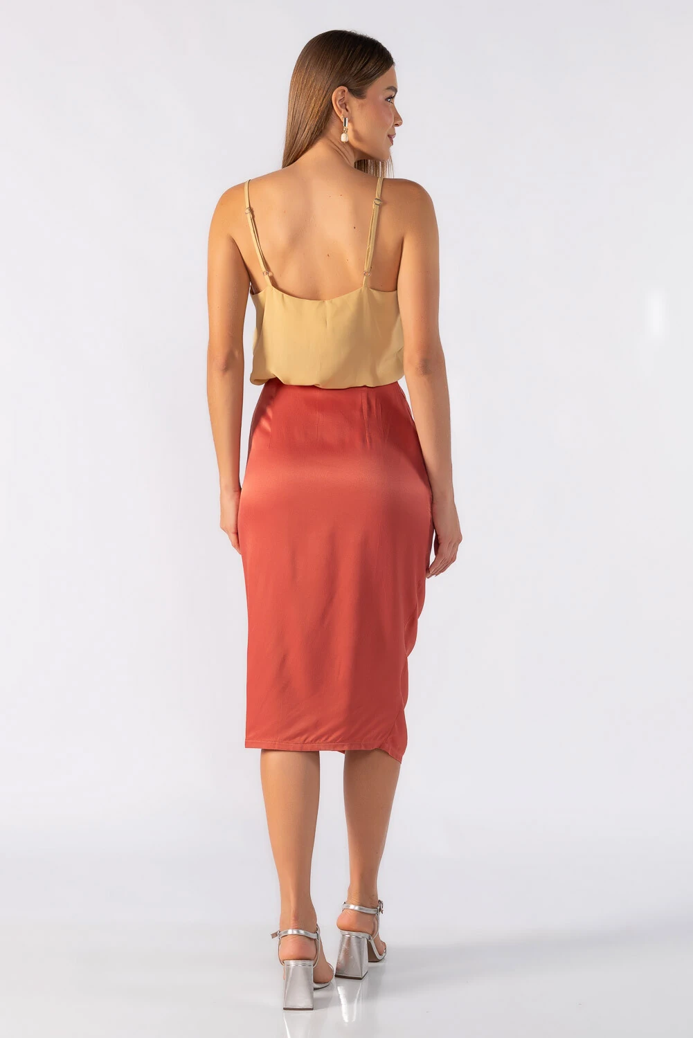 Saia midi acetinada com fenda