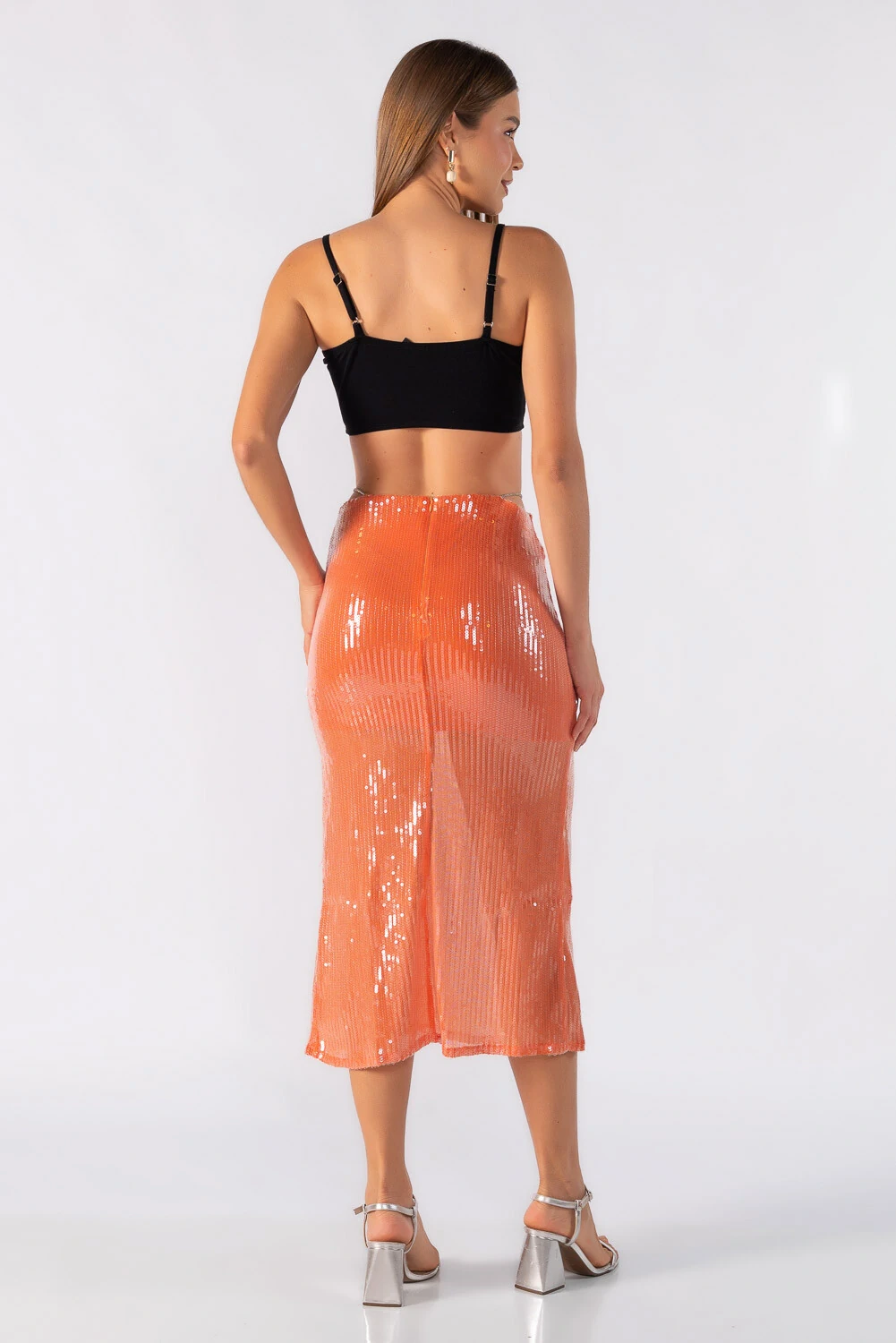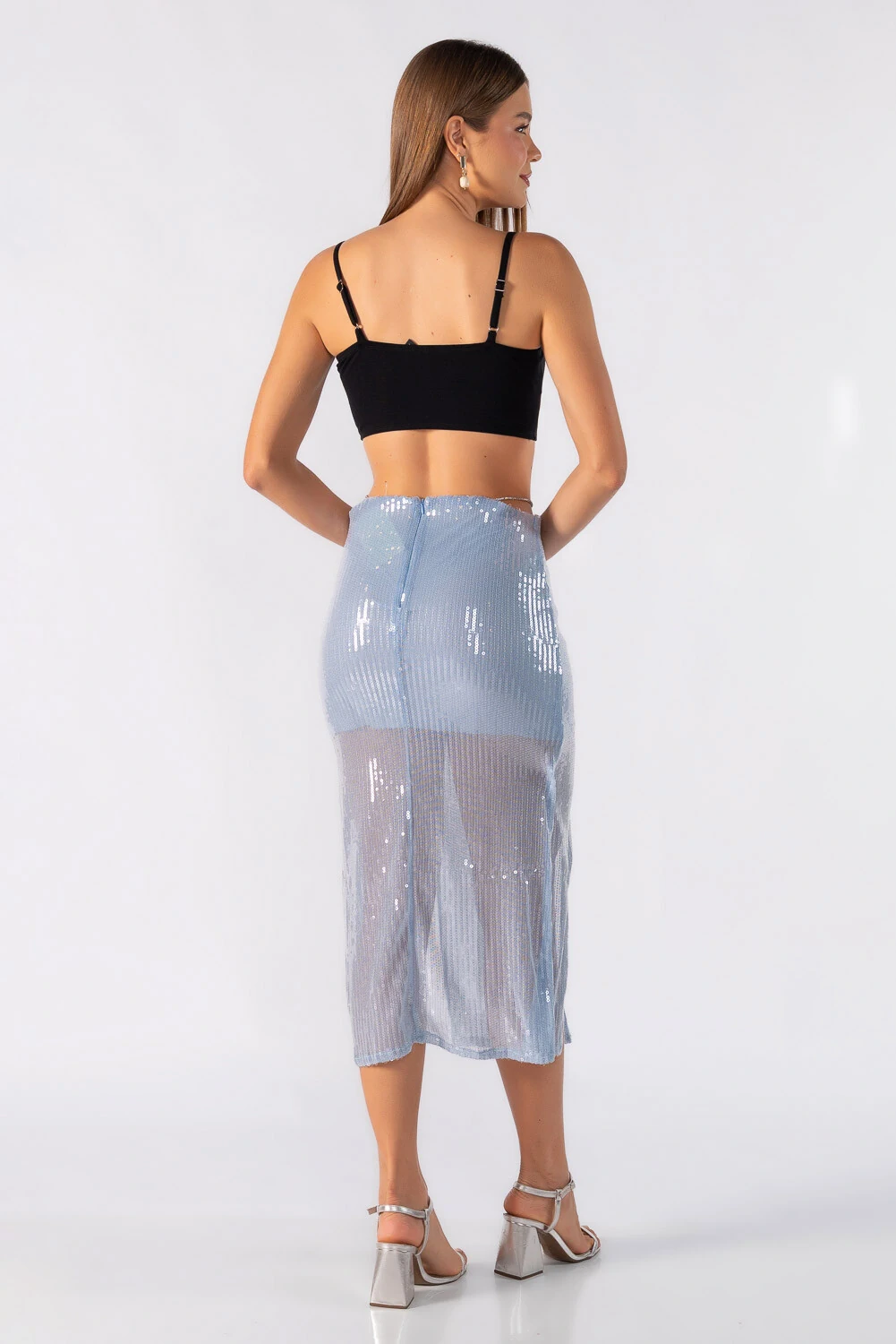 Saia midi em paetê com detalhe na cintura e duas fendas