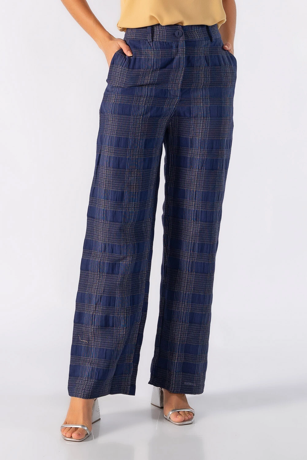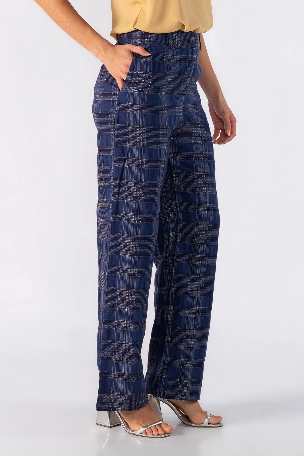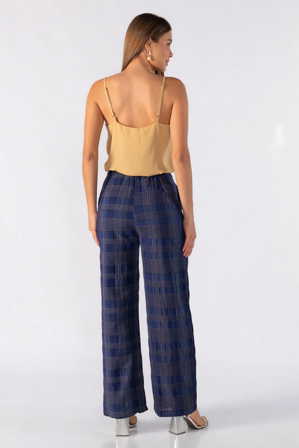 Calça pantalona xadrez em alfaiataria com bolsos