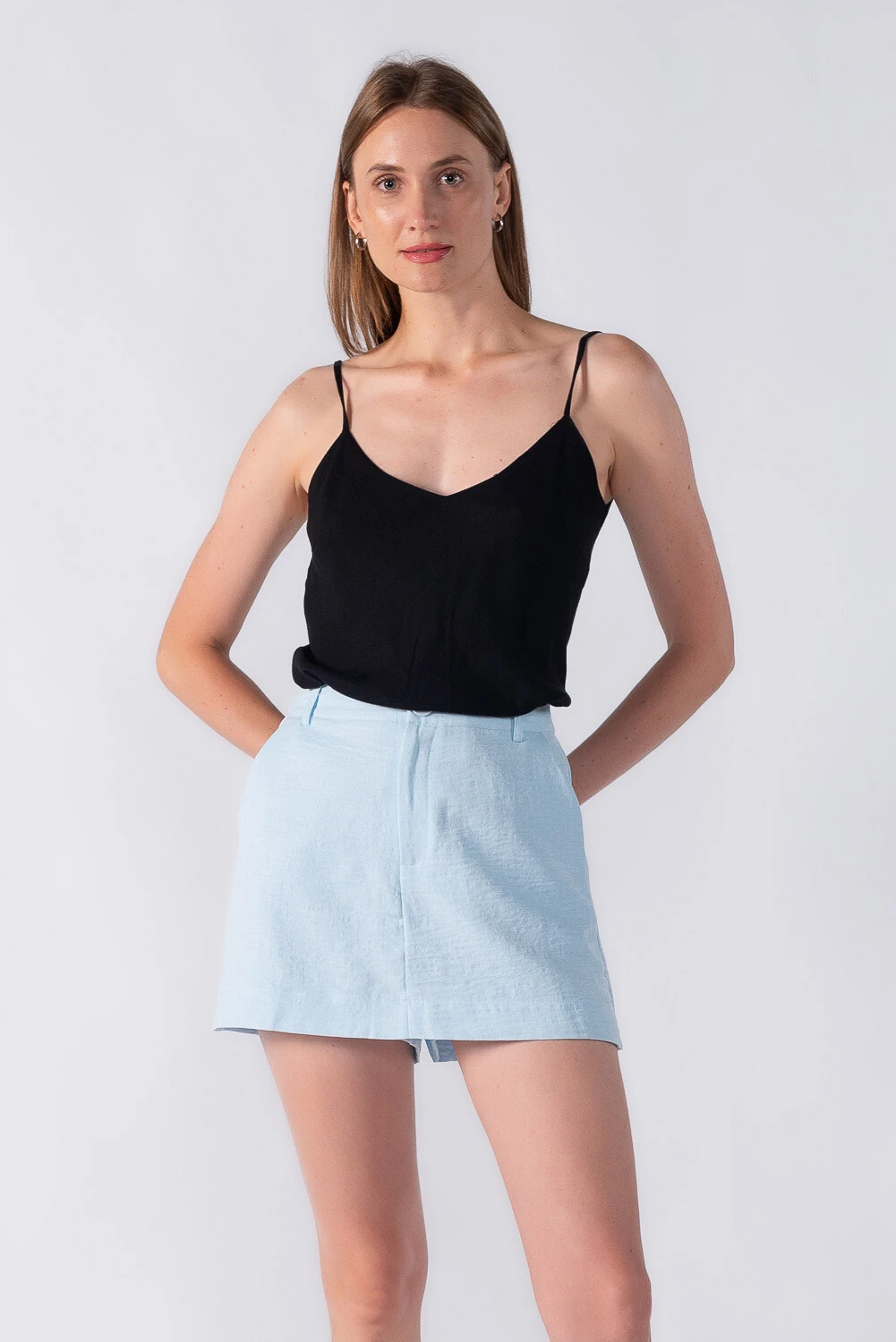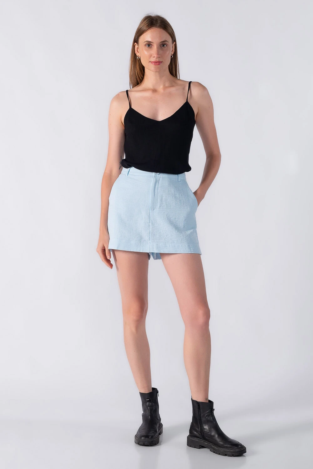 Short saia com botão forrado com bolsos