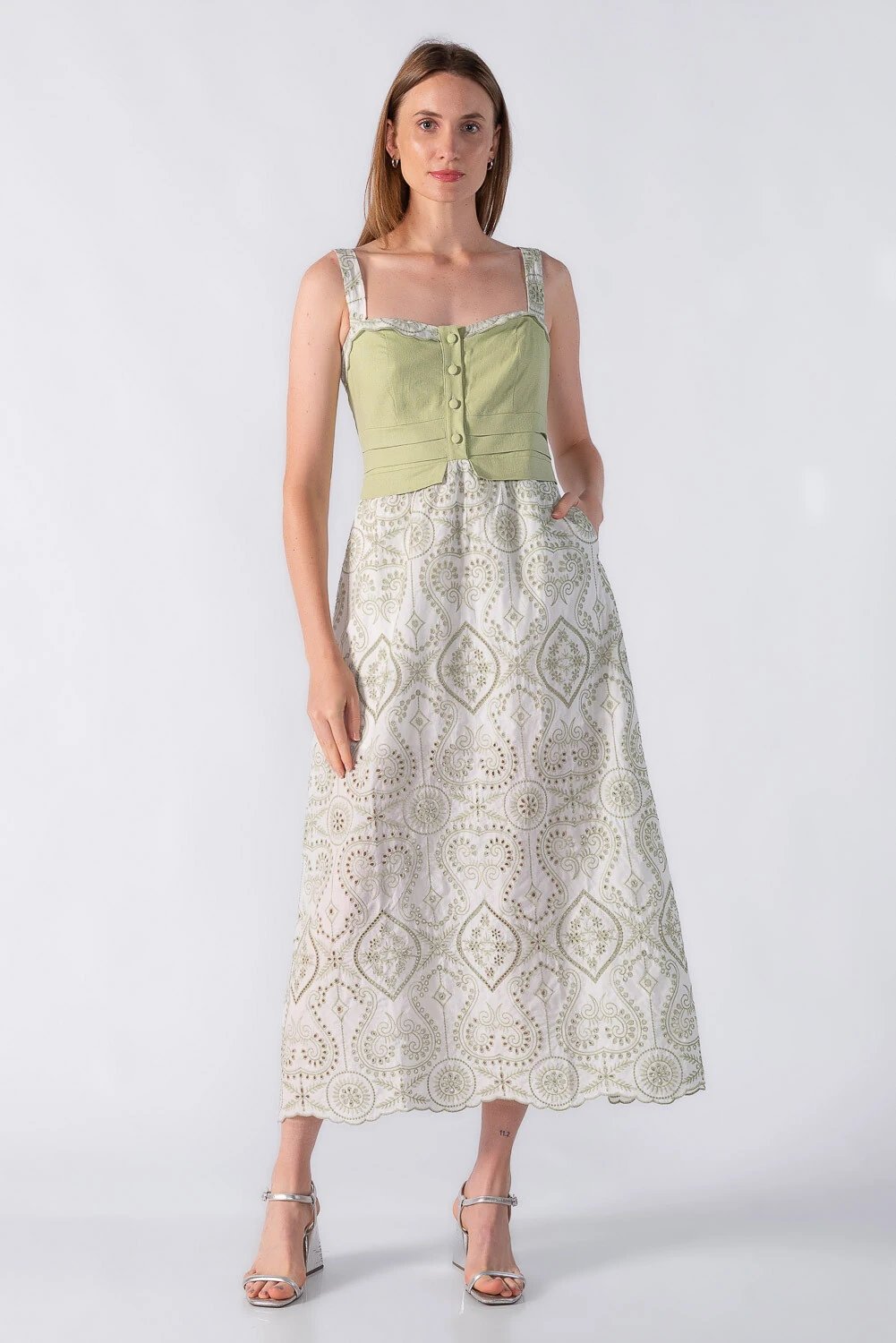 Vestido midi em laise e linho