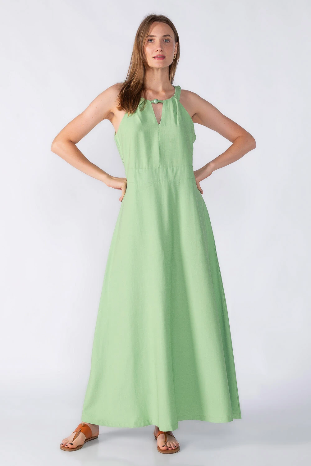 Vestido longo evase com detalhe no decote