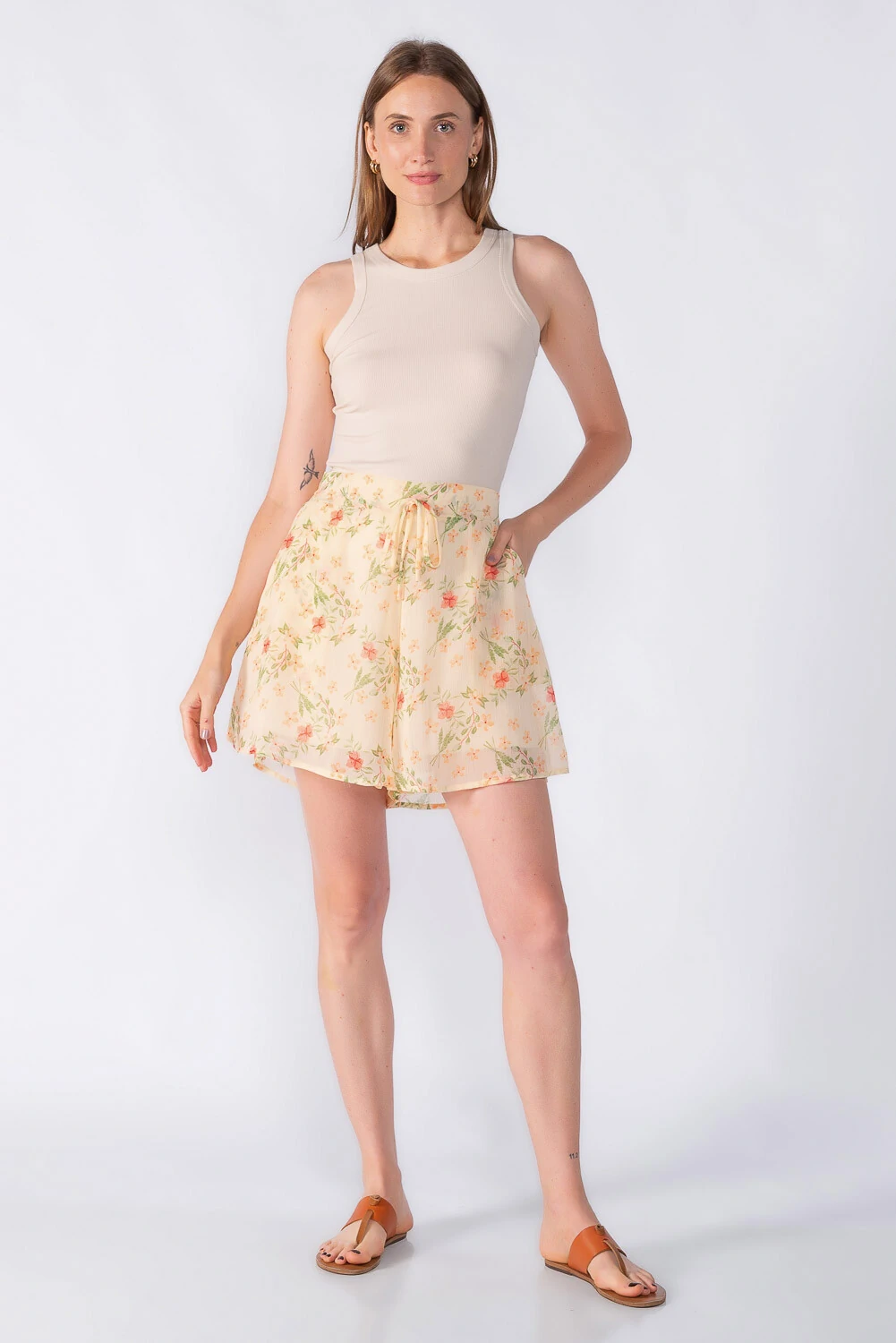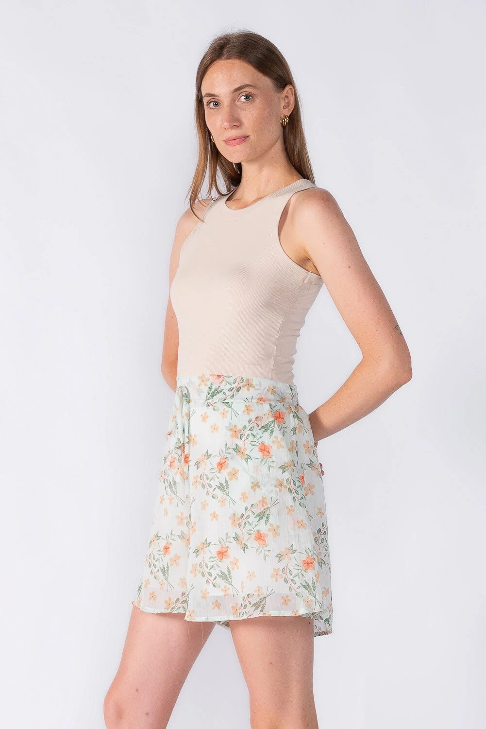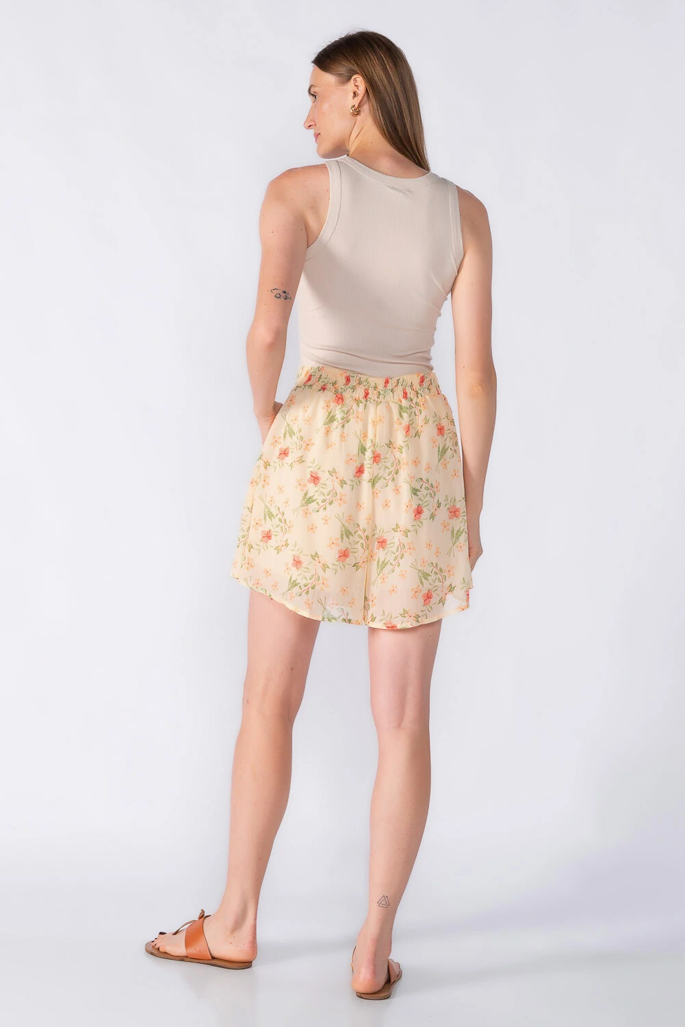 Short médio estampado em chiffon com elástico na cintura e forro