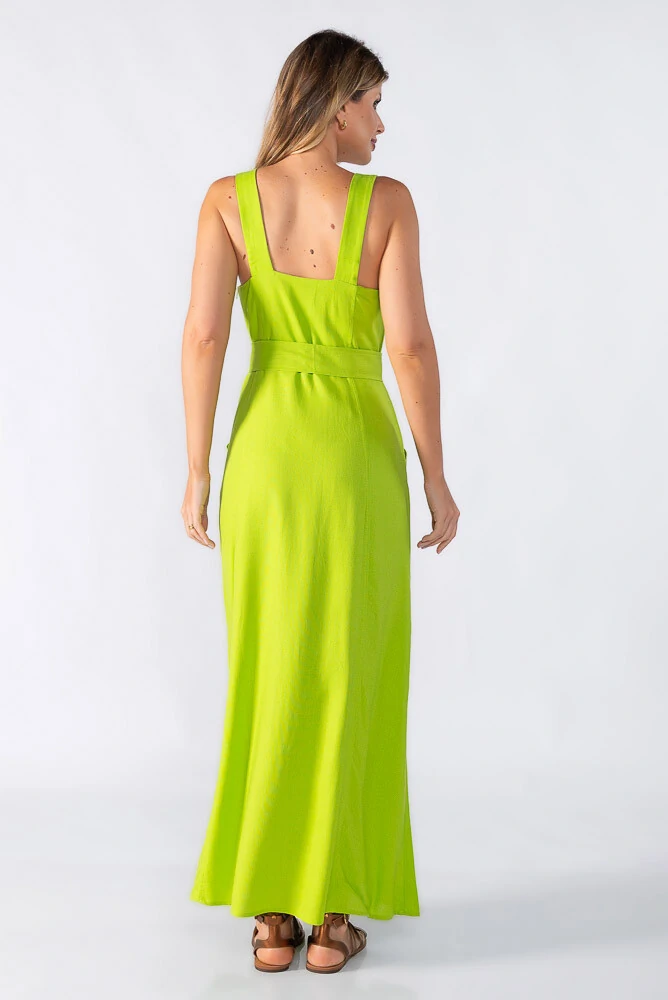 Vestido longo com recorte acinturado bolsos e cinto