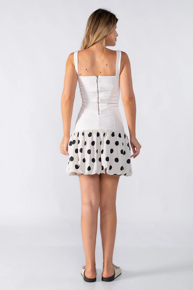 Vestido curto acinturado zíper nas costas e saia em poa