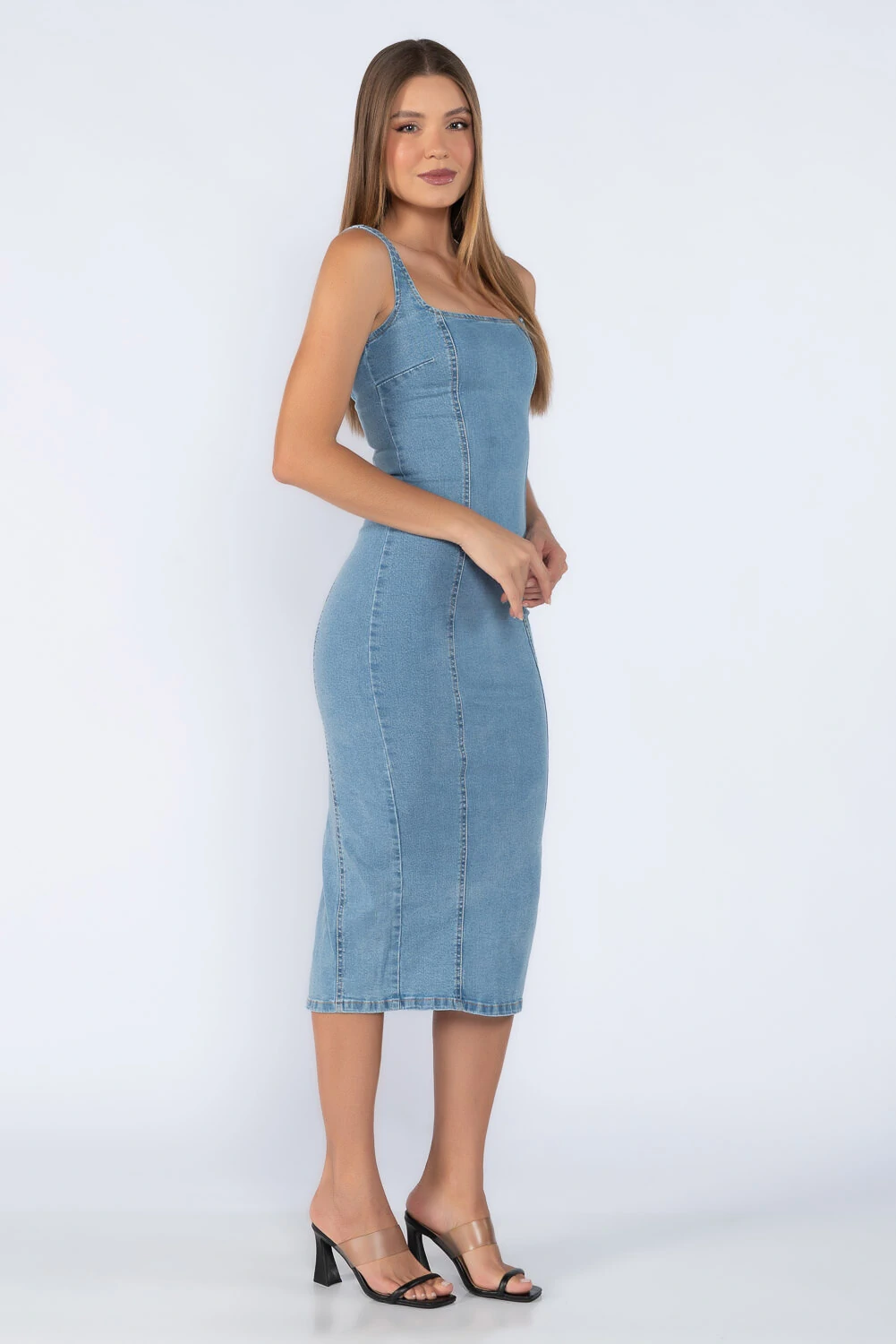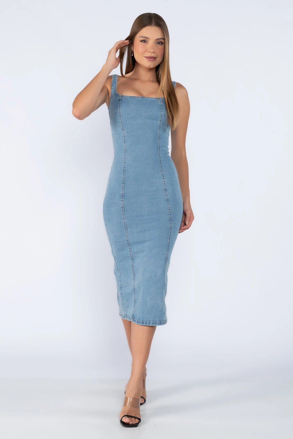 Vestido midi jeans com recortes