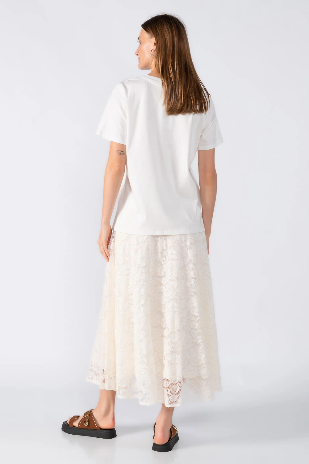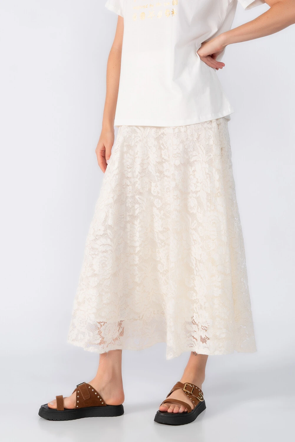 Saia midi confeccionada em renda leve, com modelagem acinturada e forro interno que proporciona conforto e segurança ao vestir. Uma peça delicada e feminina.