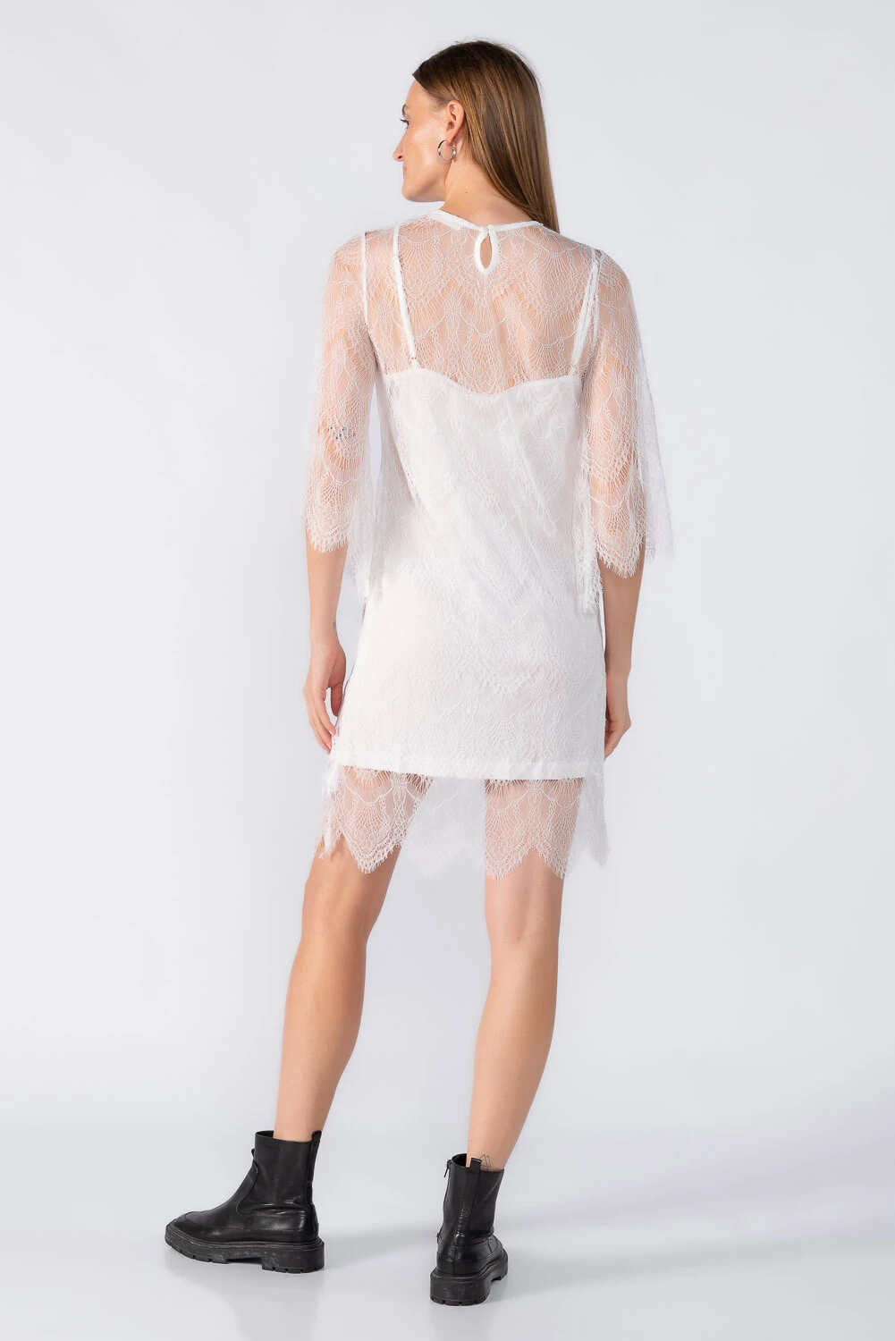 Vestido curto em renda com forro interno, trazendo delicadeza com um toque moderno. Modelagem que valoriza o corpo com conforto e leve elasticidade.
