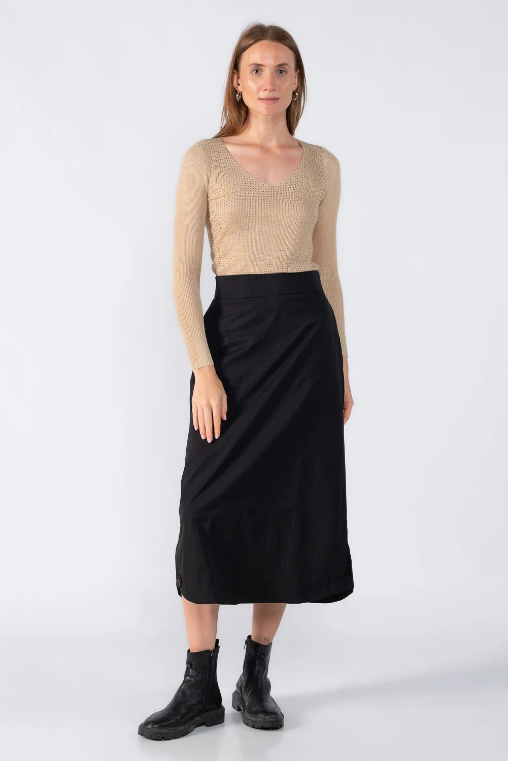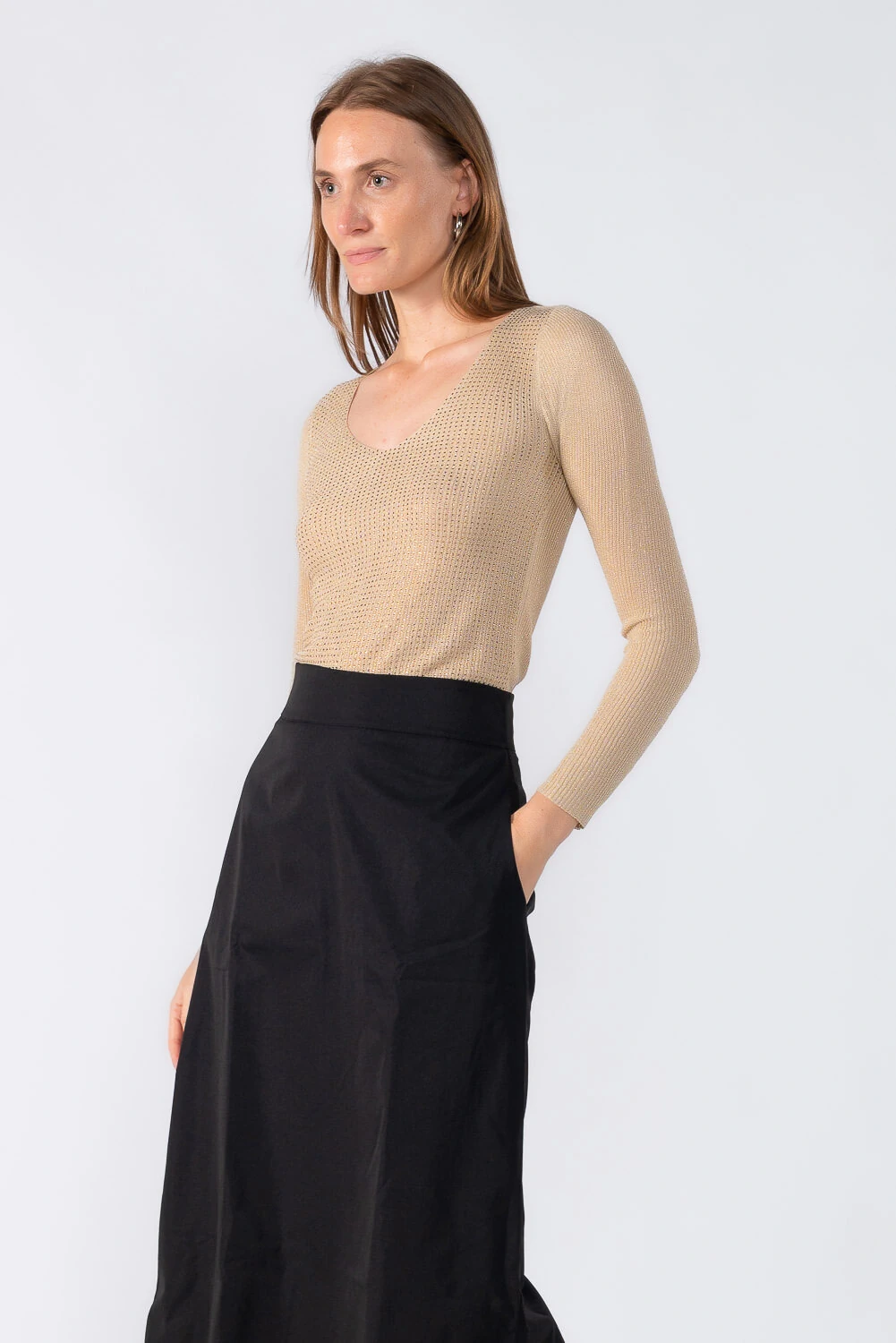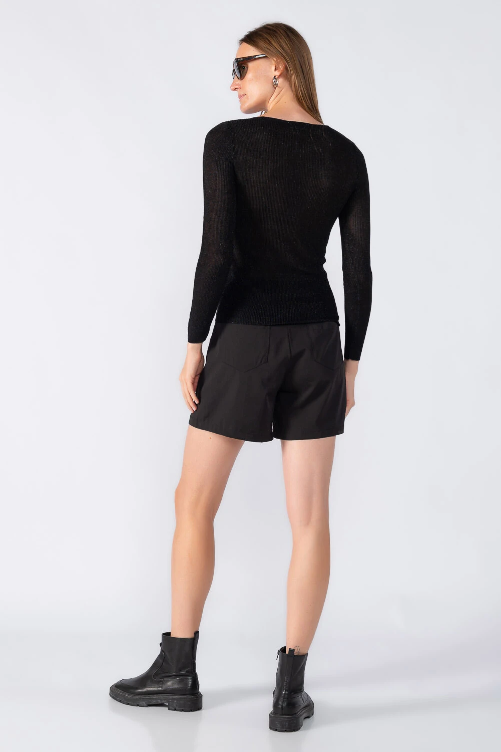 Blusa leve de manga longa com decote em V e aplicações frontais em strass, trazendo brilho sutil e toque sofisticado à peça.