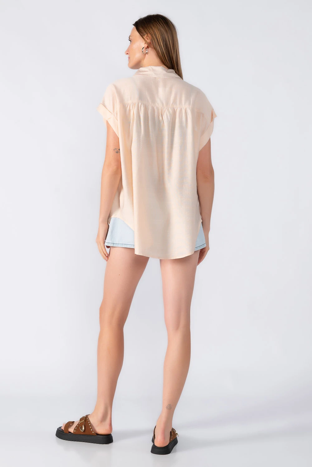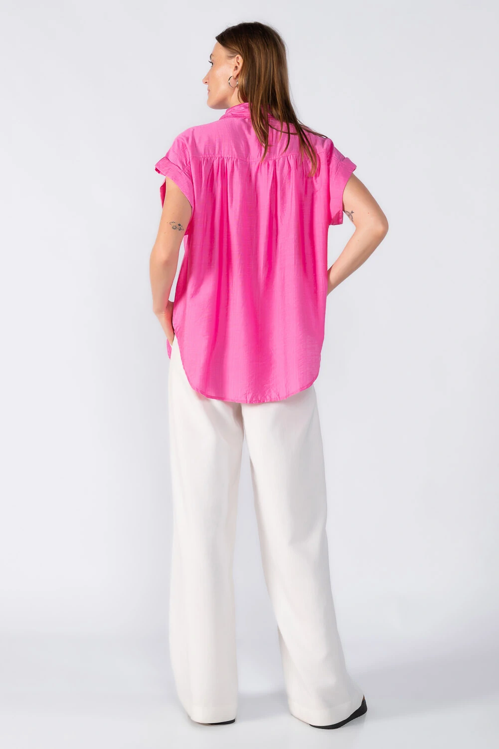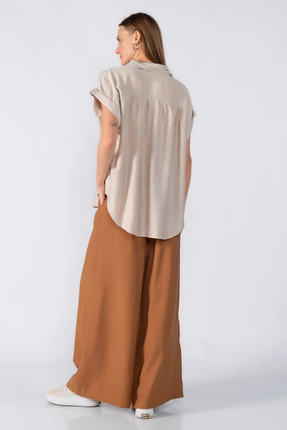 Camisa de modelagem ampla com mangas dobradas e franzido nos ombros, trazendo leveza e movimento ao visual. Uma peça moderna e versátil para composições elegantes do dia a dia.