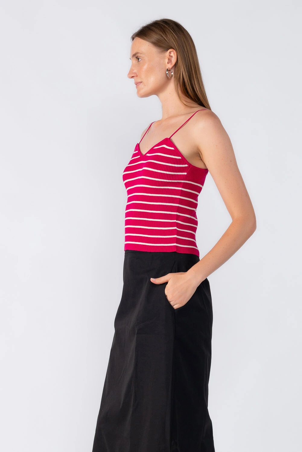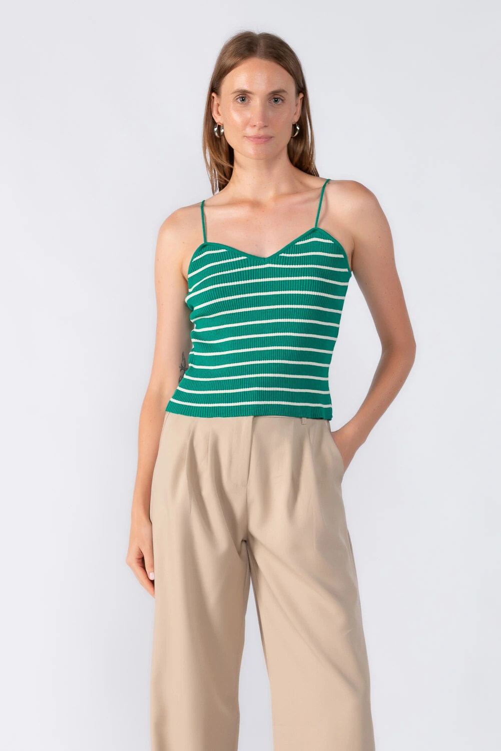 Blusa em tricot com alças finas e decote desenhado, trazendo delicadeza e sofisticação à peça. Modelagem ajustada que valoriza o corpo e permite diversas combinações.