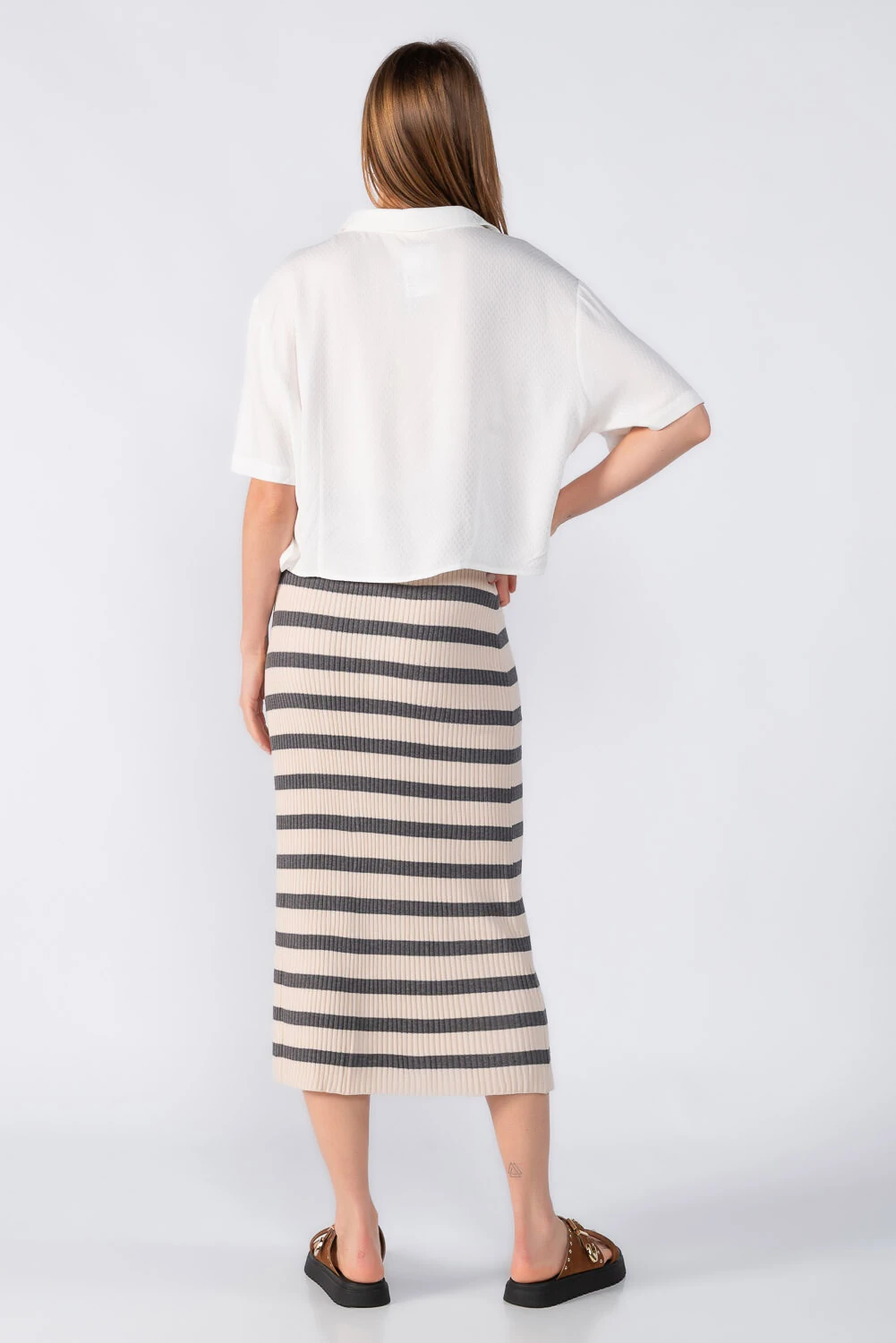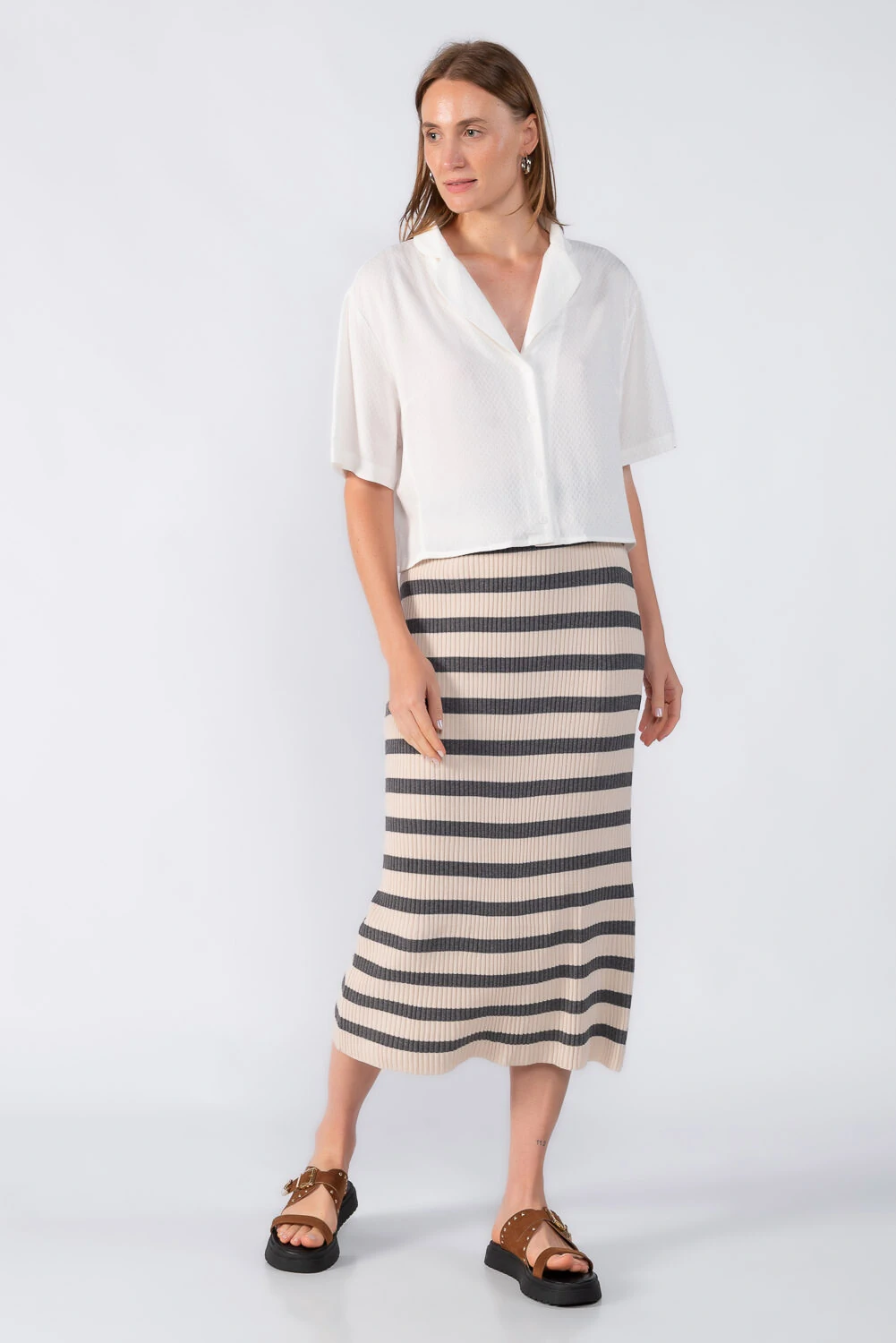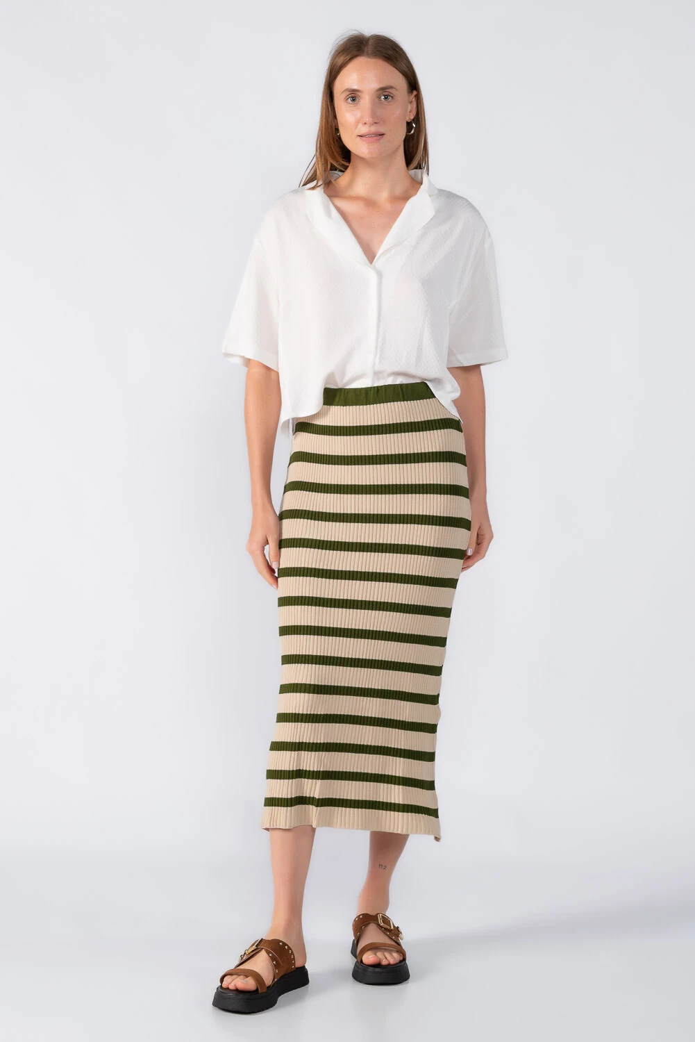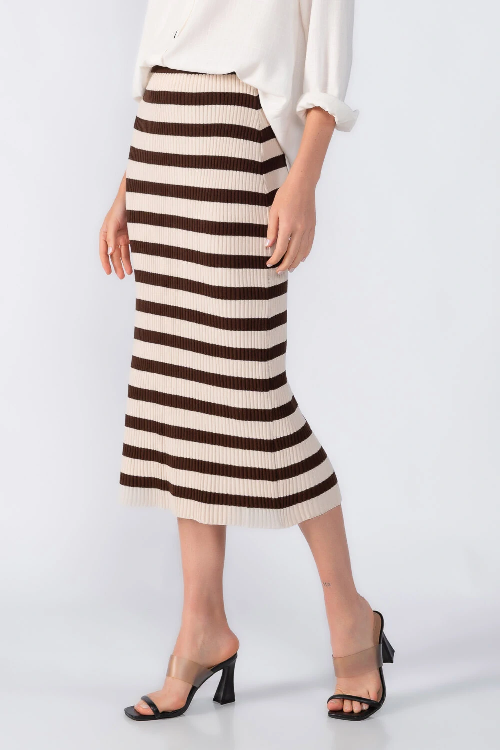 Saia midi em tricot com textura canelada e padronagem listrada. A modelagem ajustada valoriza a silhueta e cria um visual elegante e contemporâneo. Peça versátil para diferentes propostas de look.