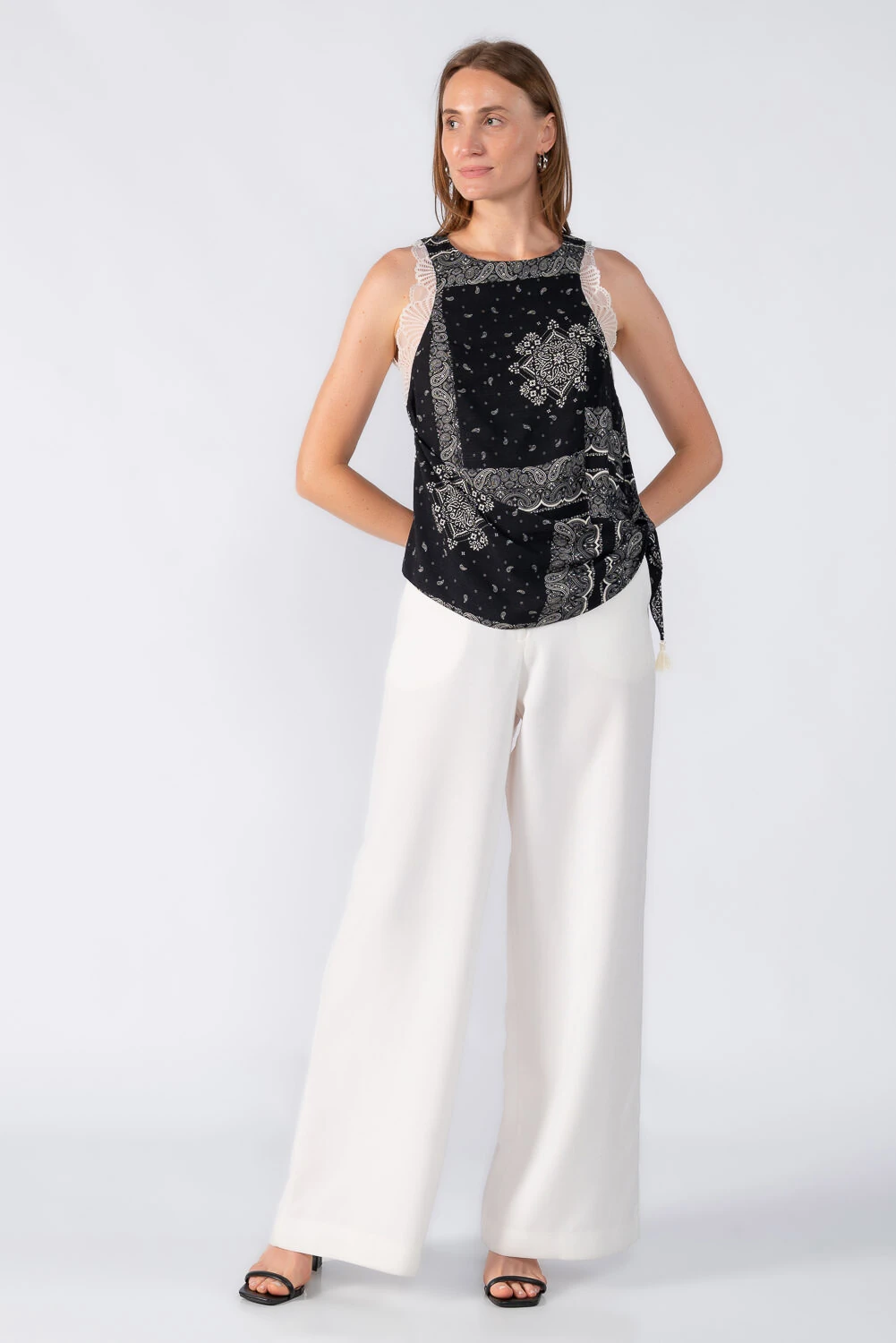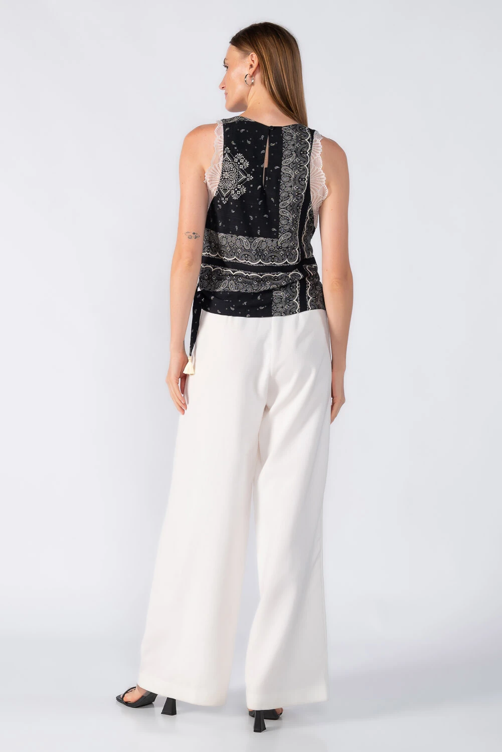 Blusa regata estampada com aplicação de renda nas laterais e detalhe de tecido transpassado na cintura, que cria um efeito moderno e valoriza a silhueta. Uma peça feminina com design diferenciado.