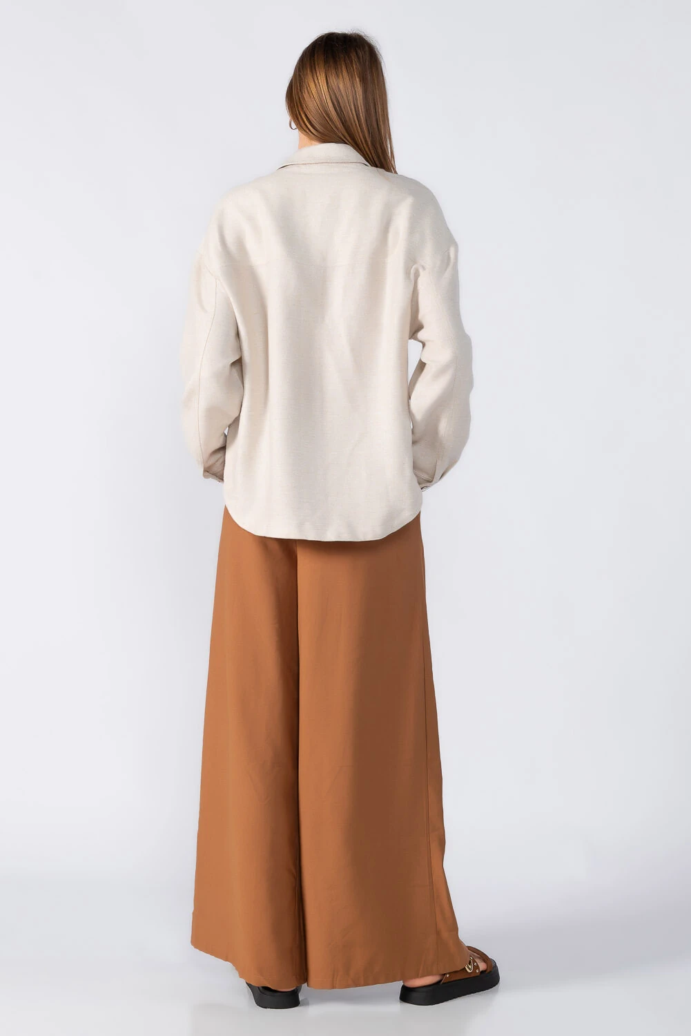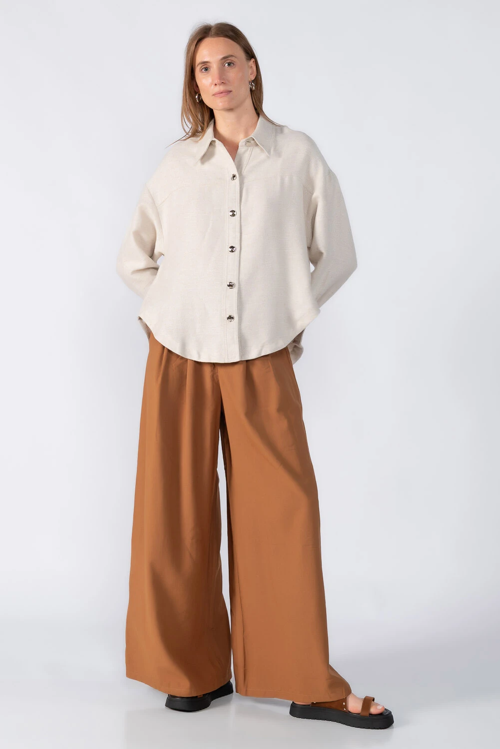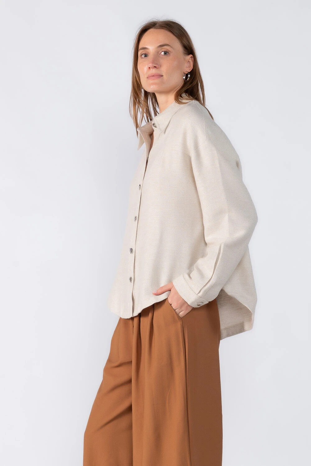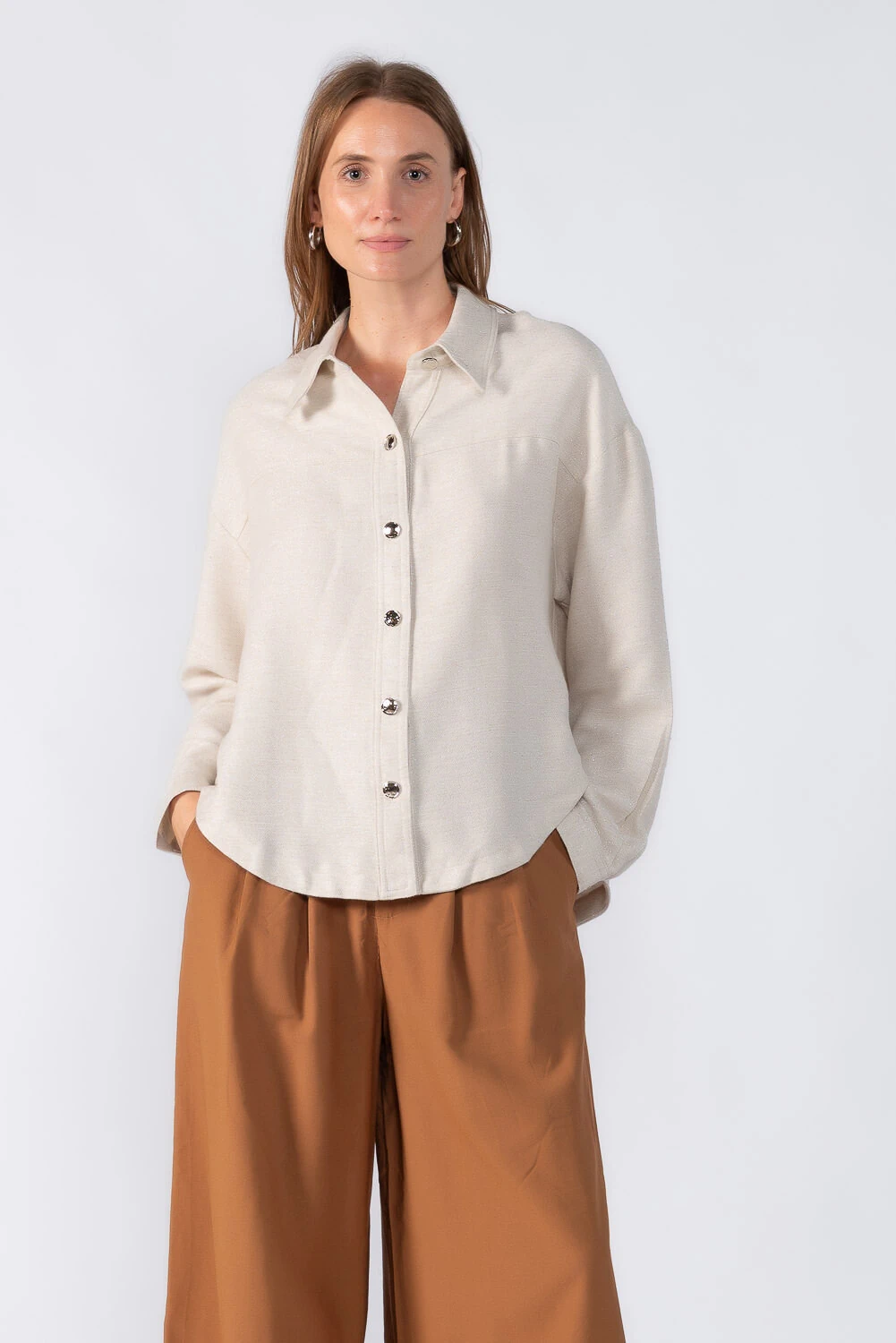 Jaqueta de modelagem ampla com fios de lurex que trazem brilho sutil ao visual. Possui botões prata de formato orgânico, adicionando um toque contemporâneo à peça.