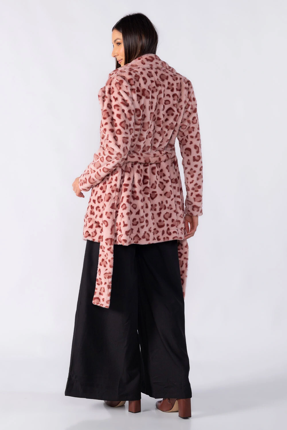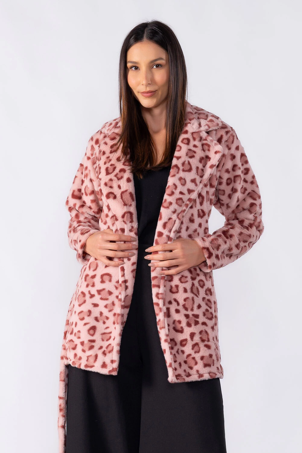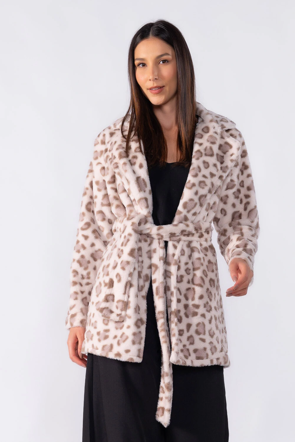 Casaco de comprimento médio em animal print com faixa para amarração, trazendo elegância e destaque na medida certa. Ideal para elevar produções do dia a dia.