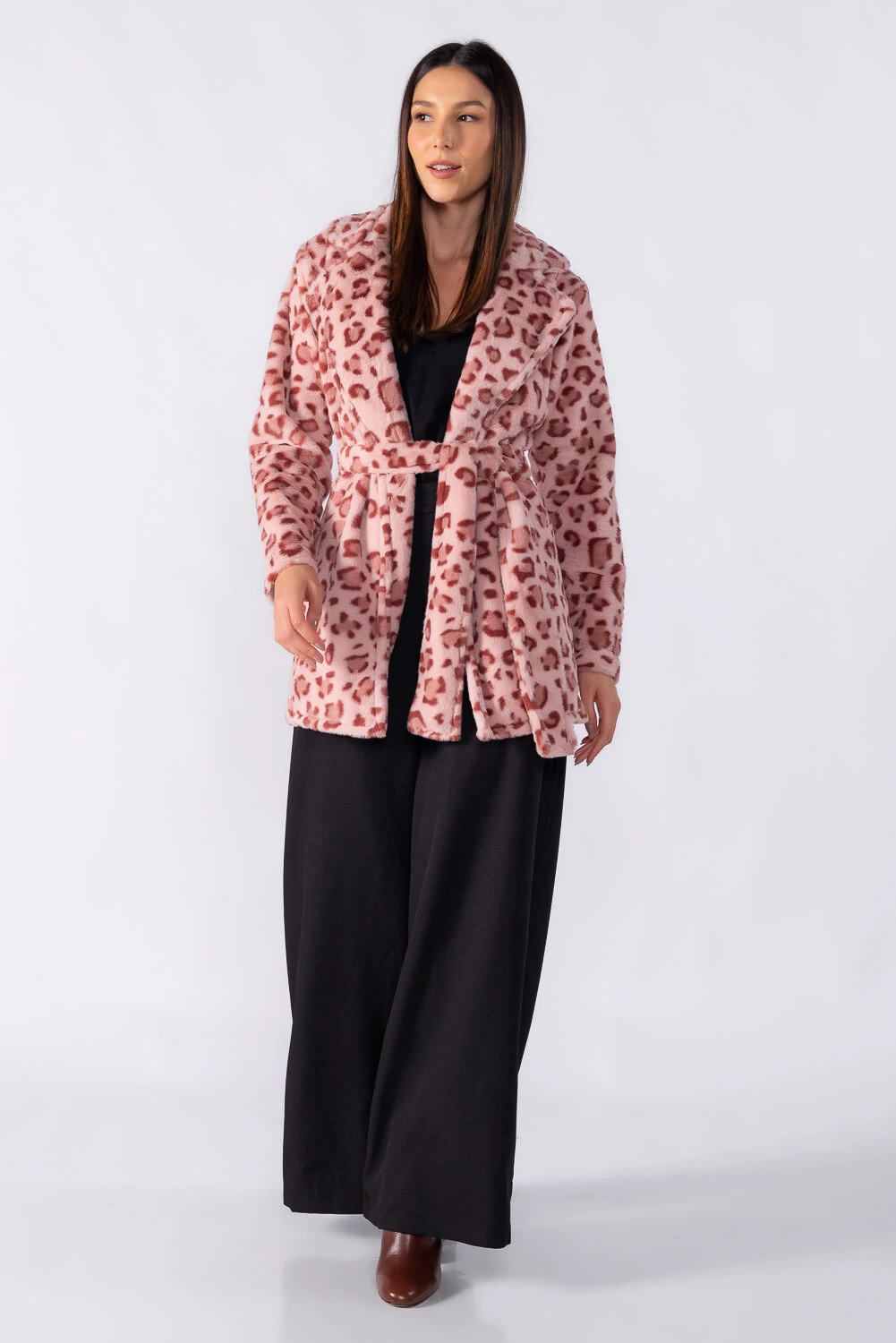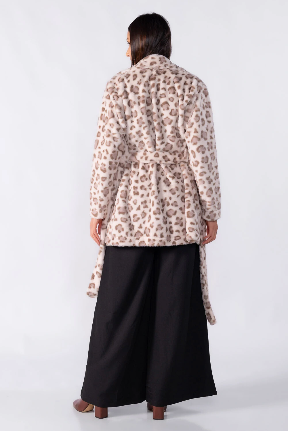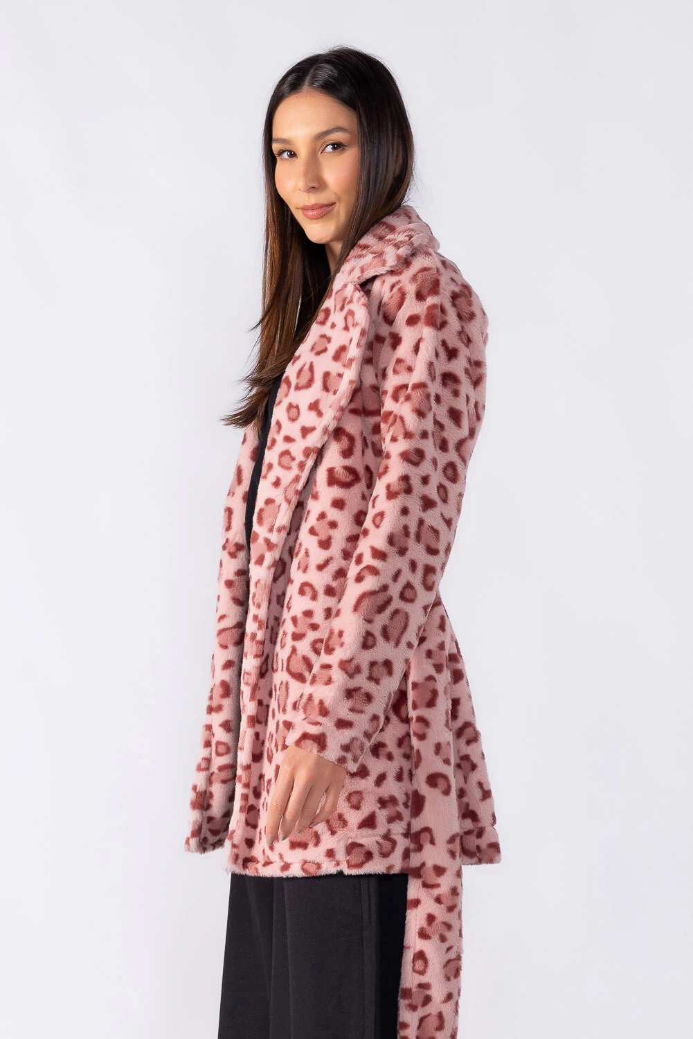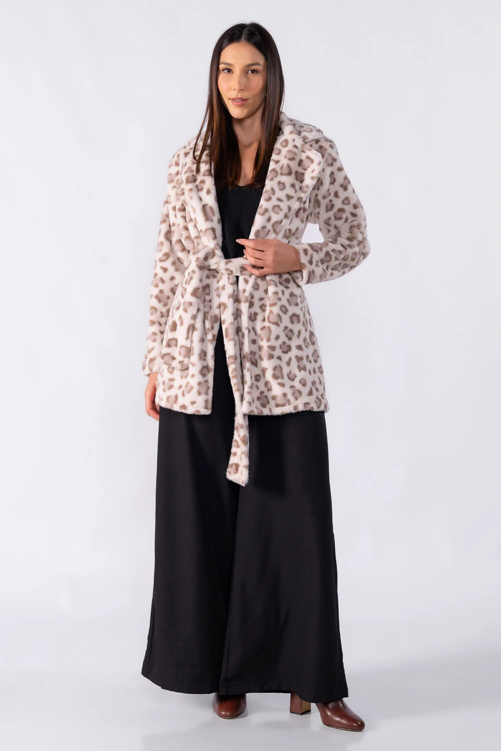 Casaco de comprimento médio em animal print com faixa para amarração, trazendo elegância e destaque na medida certa. Ideal para elevar produções do dia a dia.
