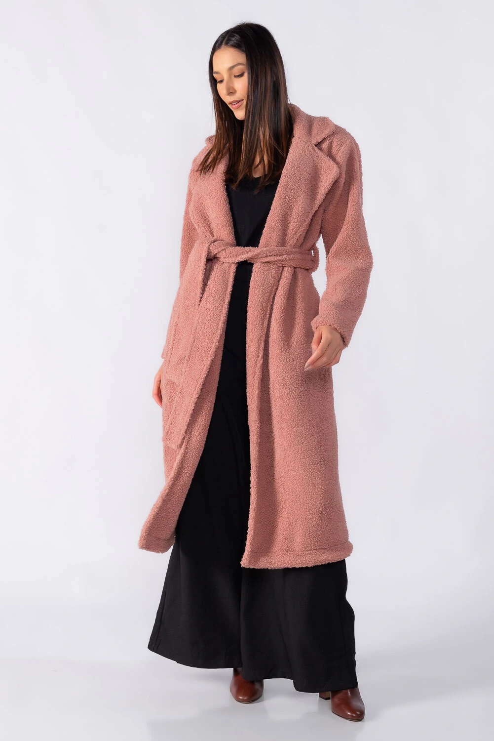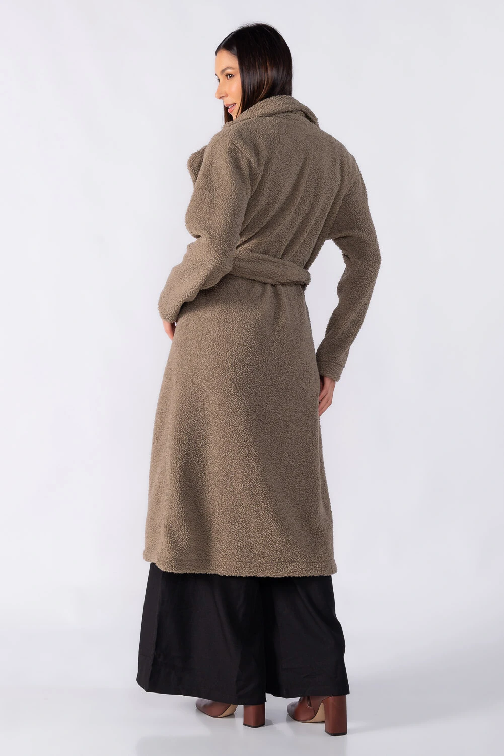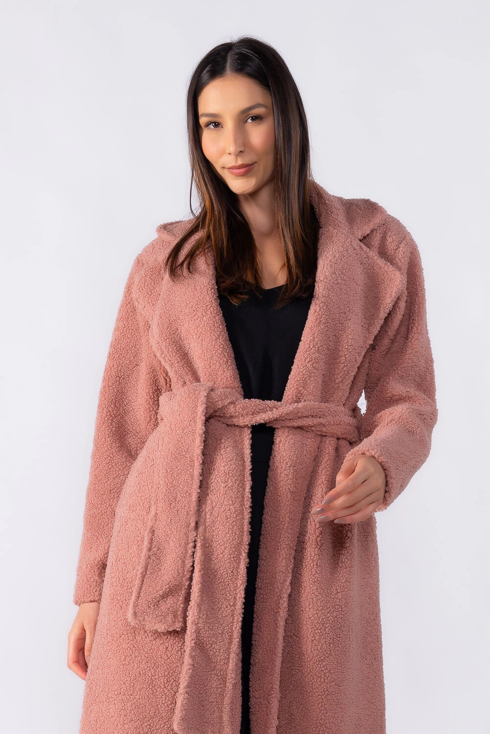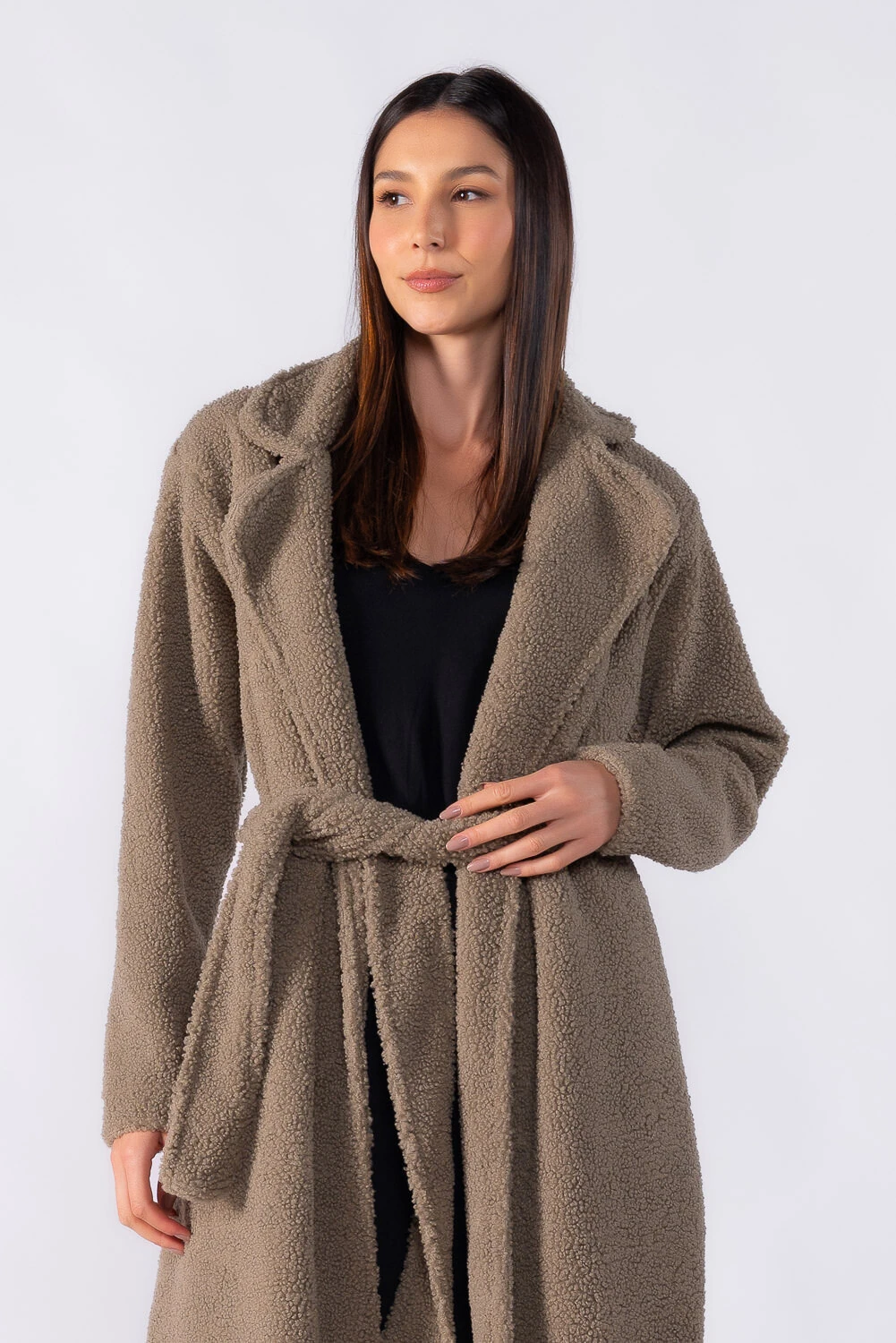 Sobretudo longo em tecido teddy com faixa para amarração, proporcionando máximo conforto e um visual sofisticado nos dias frios. Textura macia e aconchegante.