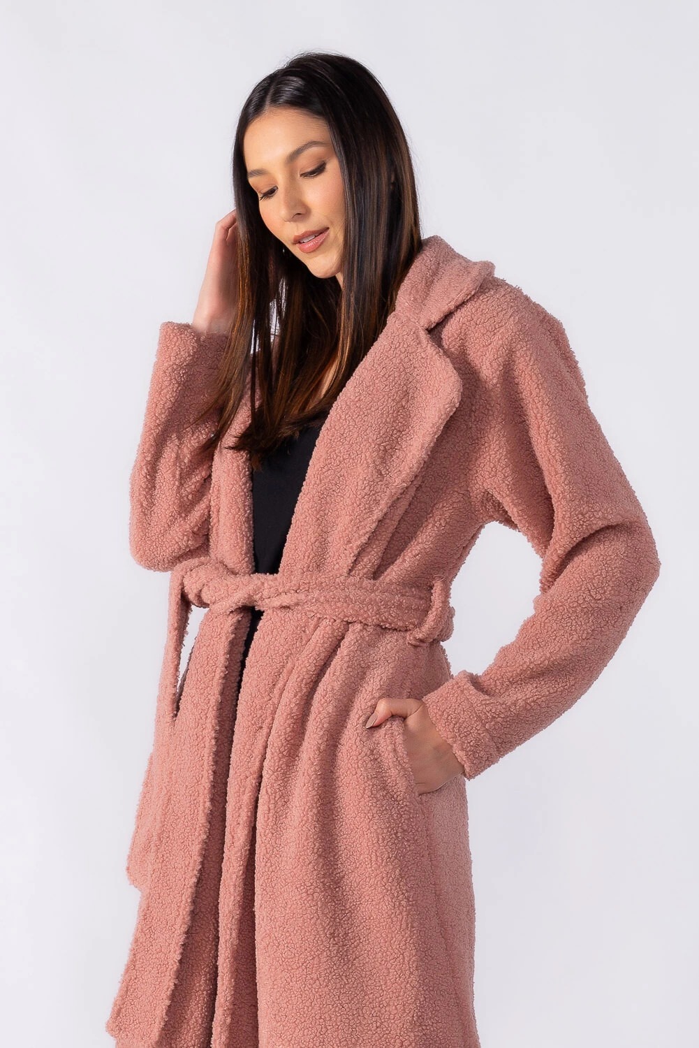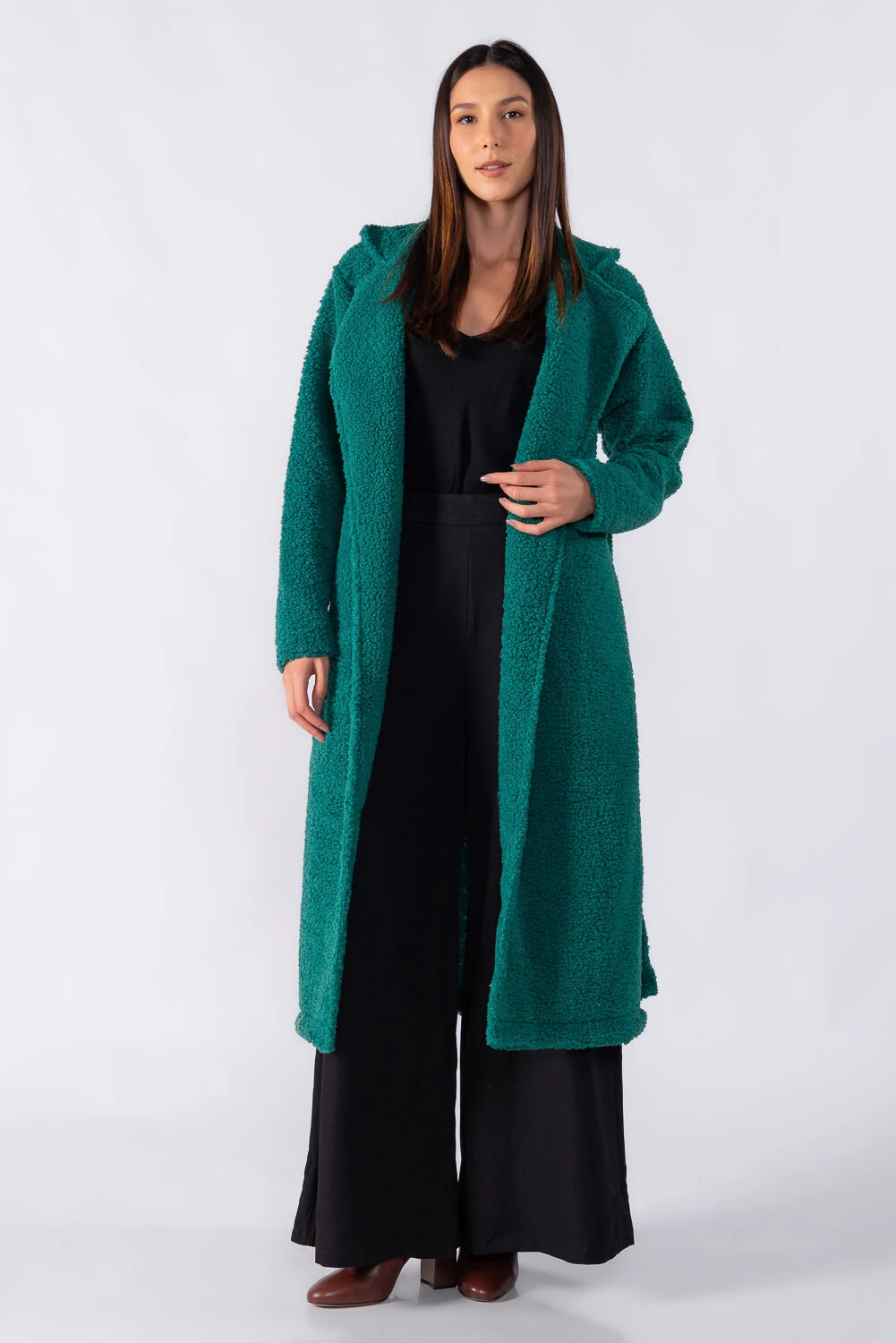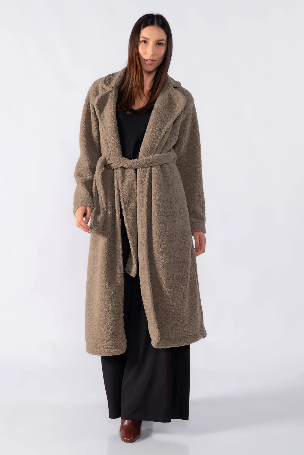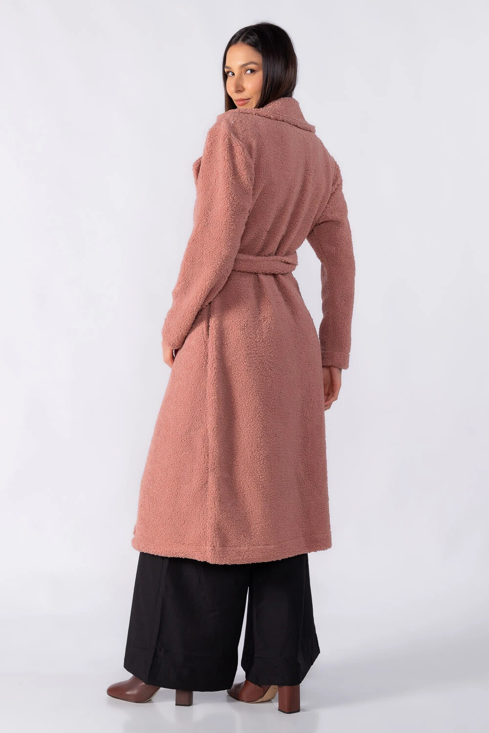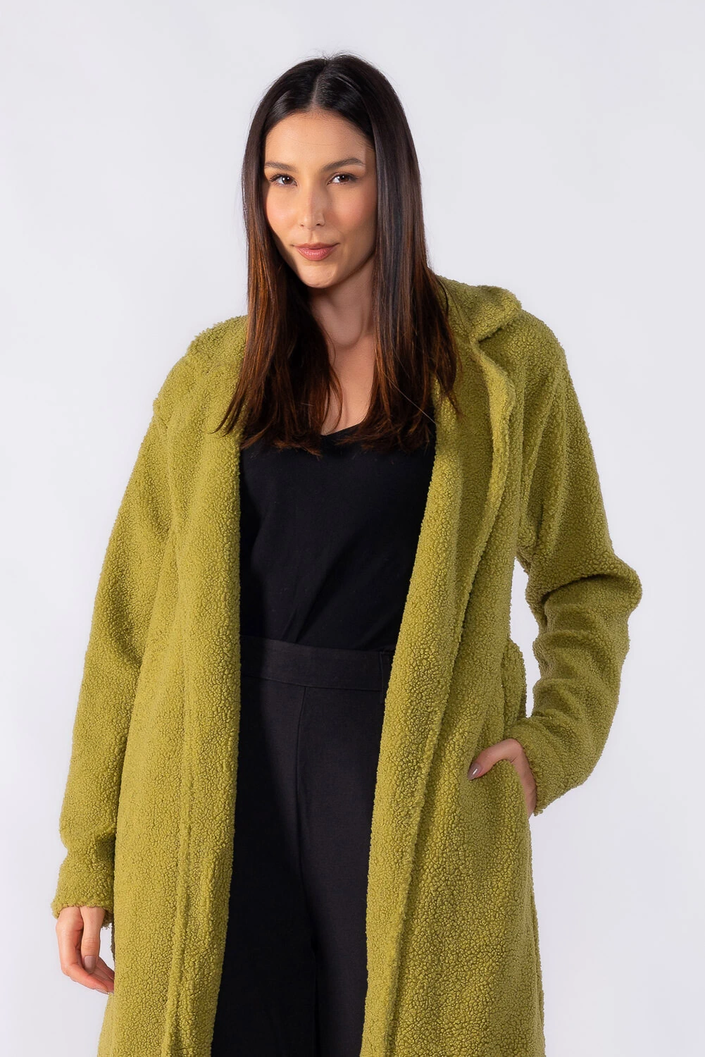 Sobretudo longo em tecido teddy com faixa para amarração, proporcionando máximo conforto e um visual sofisticado nos dias frios. Textura macia e aconchegante.
