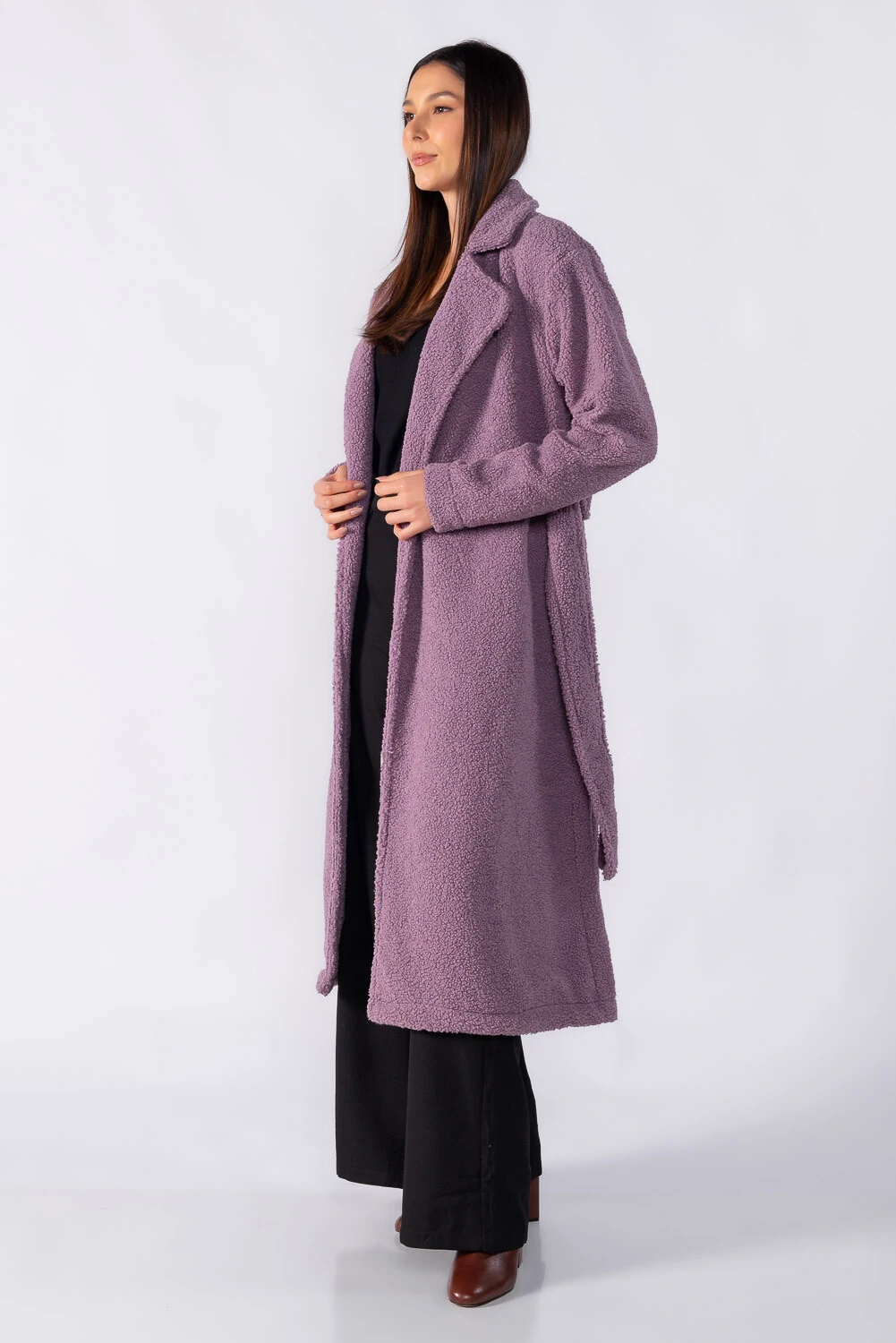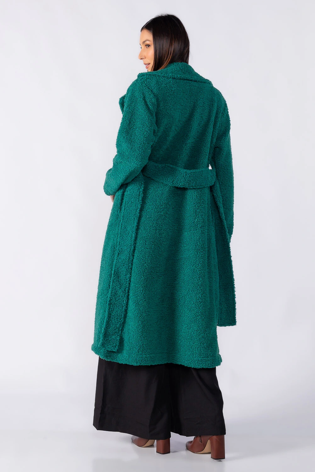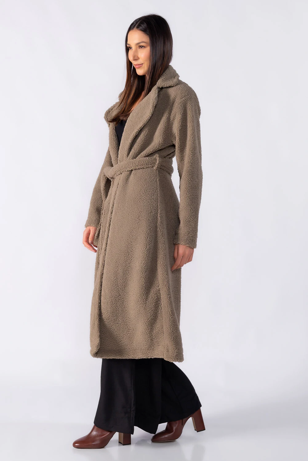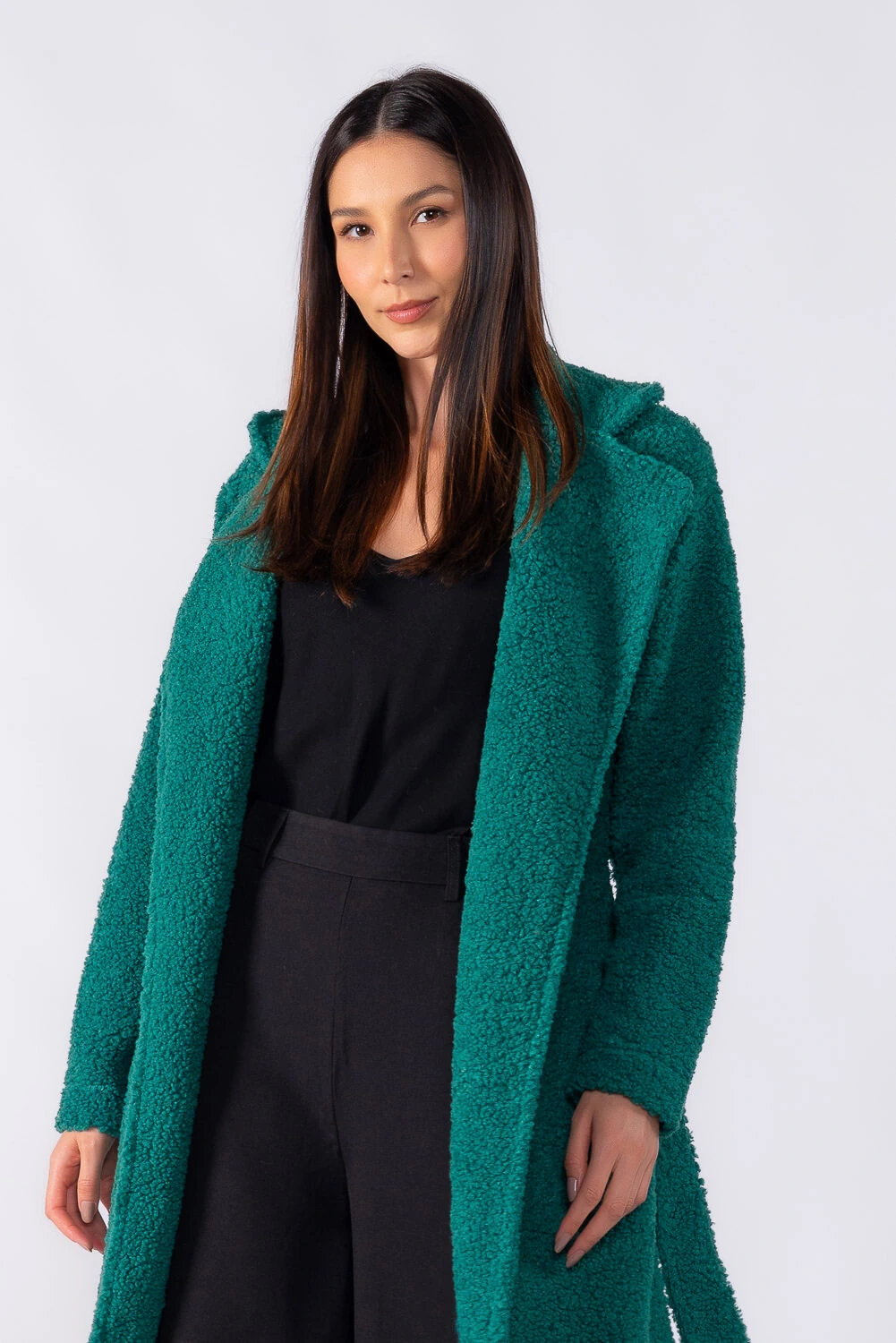 Sobretudo longo em tecido teddy com faixa para amarração, proporcionando máximo conforto e um visual sofisticado nos dias frios. Textura macia e aconchegante.