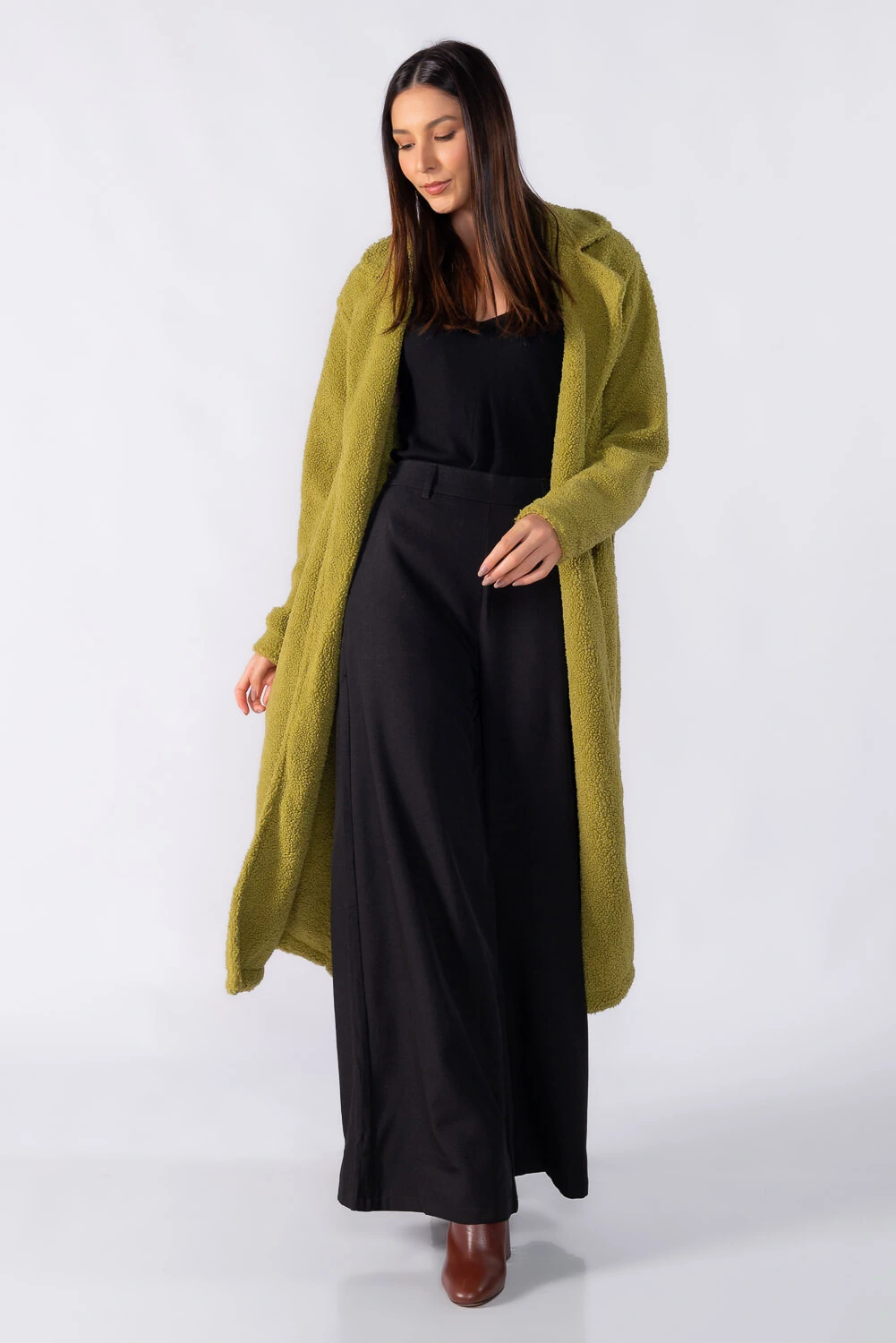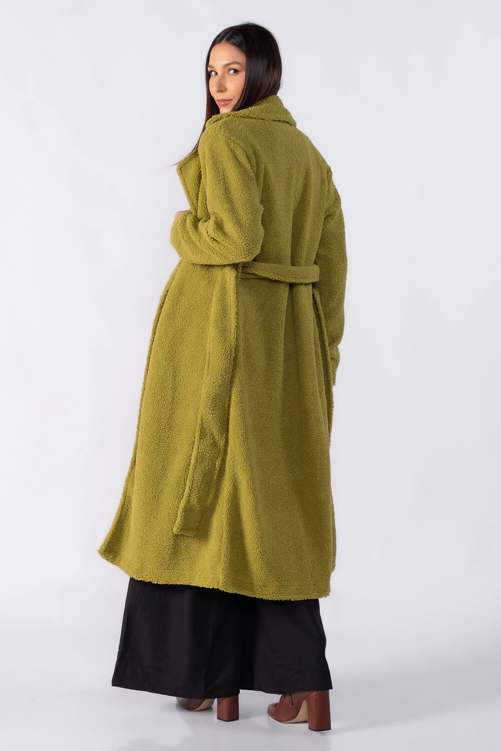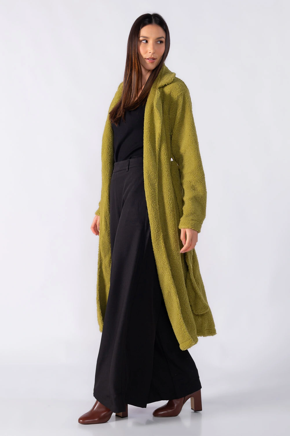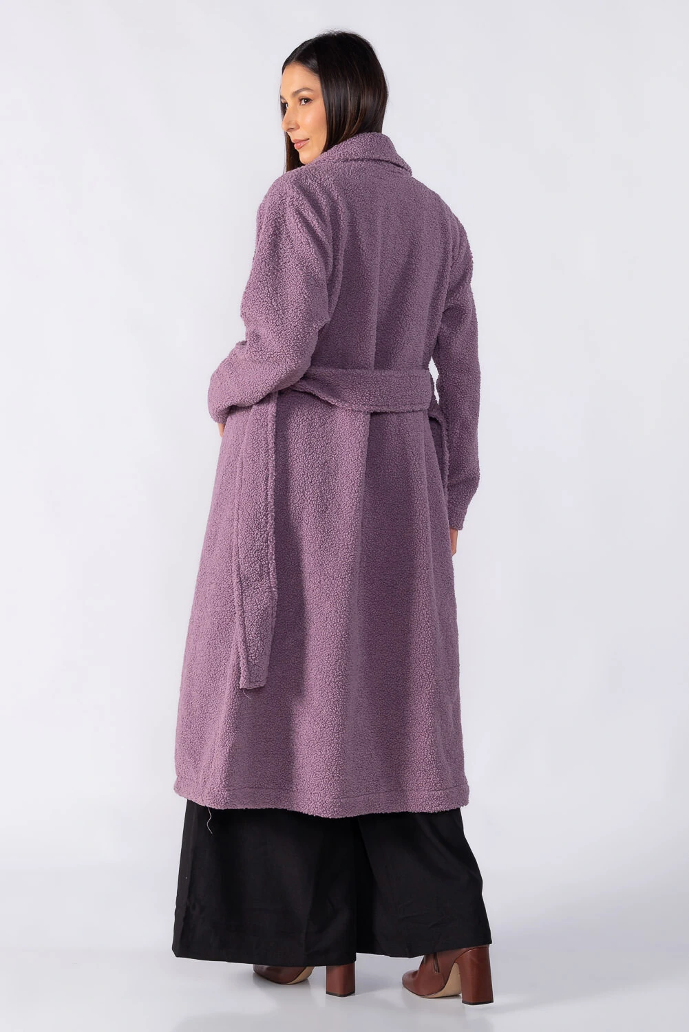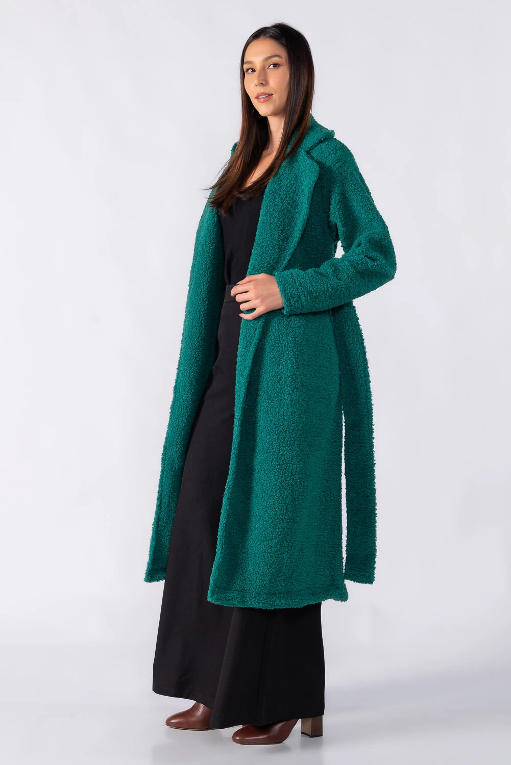Sobretudo longo em tecido teddy com faixa para amarração, proporcionando máximo conforto e um visual sofisticado nos dias frios. Textura macia e aconchegante.