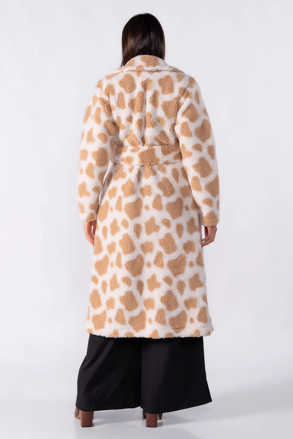Sobretudo longo em animal print com faixa para amarração, que valoriza a silhueta e traz um toque sofisticado ao look. Peça marcante e versátil para os dias mais frios.